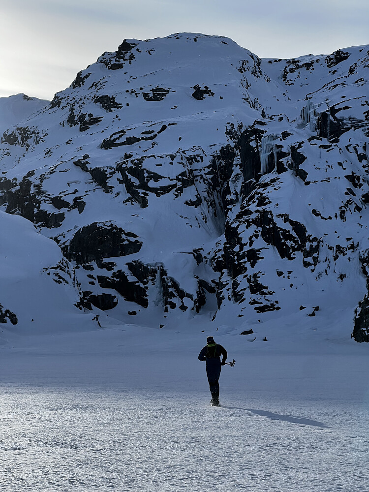 Tærne var iskalde i løpeskoene, selv med tykk ullsokk. Den kraftige vinden og lave temperaturen var nådeløs. Det begynte å svi på venstre fot. Skulle hatt et par med en integrert gamasje. Vi hørte også en rekke drønn på veien. Skredfaren var stor.