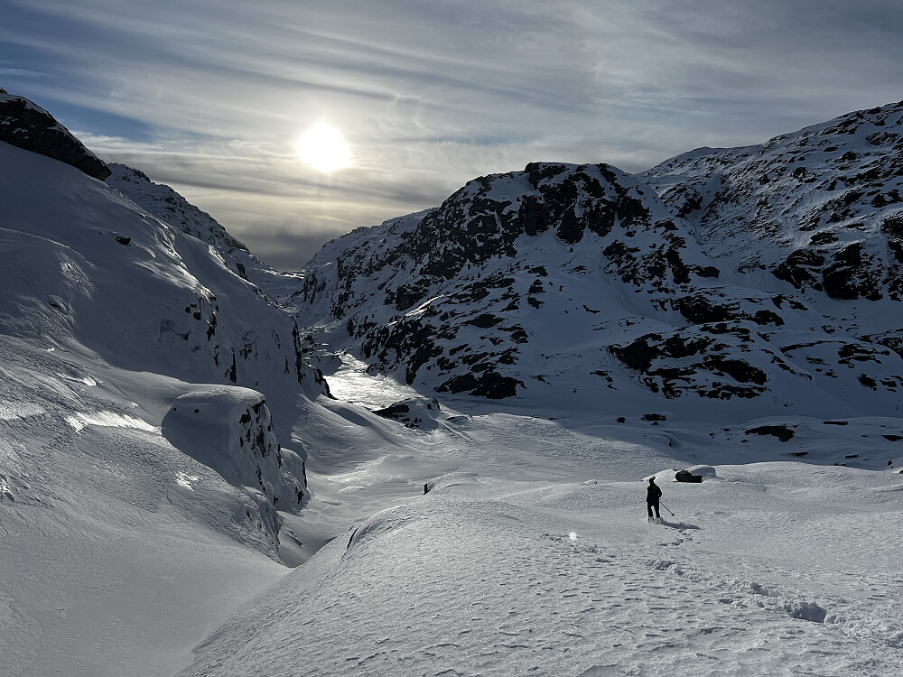 Været var fint med vintersol på fjellene rundt oss. Vinden var isende kald. Vi hadde trodd at vi skulle slippe unna i dag da den skulle komme fra øst, men neida. Skulle hatt leggbeskyttere også til gjennomslagskaren her og der. Nede i Storagrøbotnen tok jeg på broddene. Fredrik tok på truger.