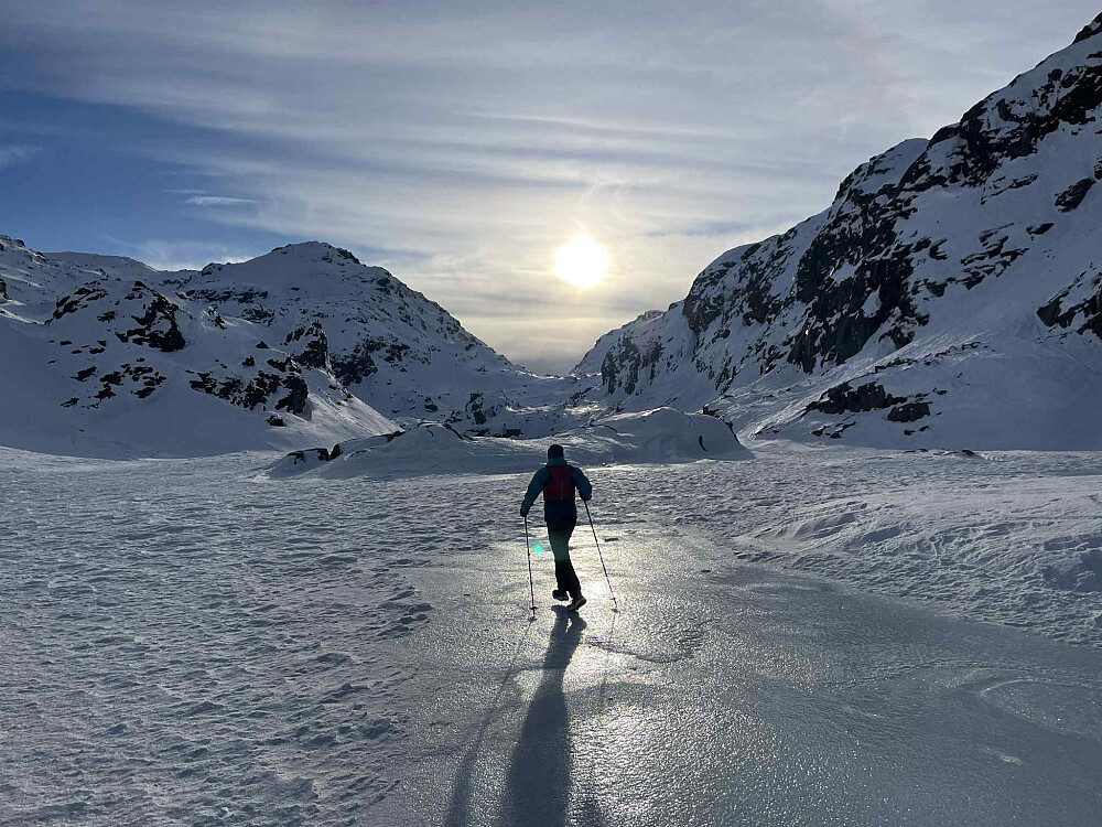 Vi tok oss ned til Holmavatnet via skaret mot bukten lengst sør, altså dit vi hadde droppet å gå opp. Innså at dette var helt uproblematisk å ta seg ned mtp skred. Det gikk radig over Holmavatnet med vinden i ryggen og ved å bare følge sporene videre, tok det ikke så lang tid før vi var nede i lien. Fredrik hektet på et tidspunkt den ene trugen i skaren og tok en “supermann-flyvning” ned en bratt flanke.