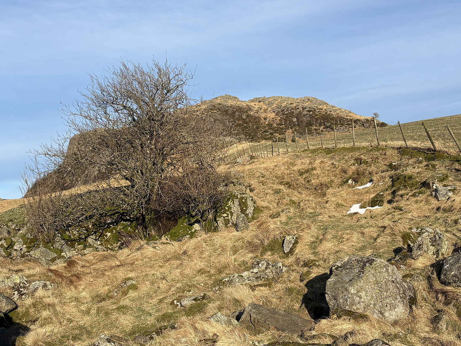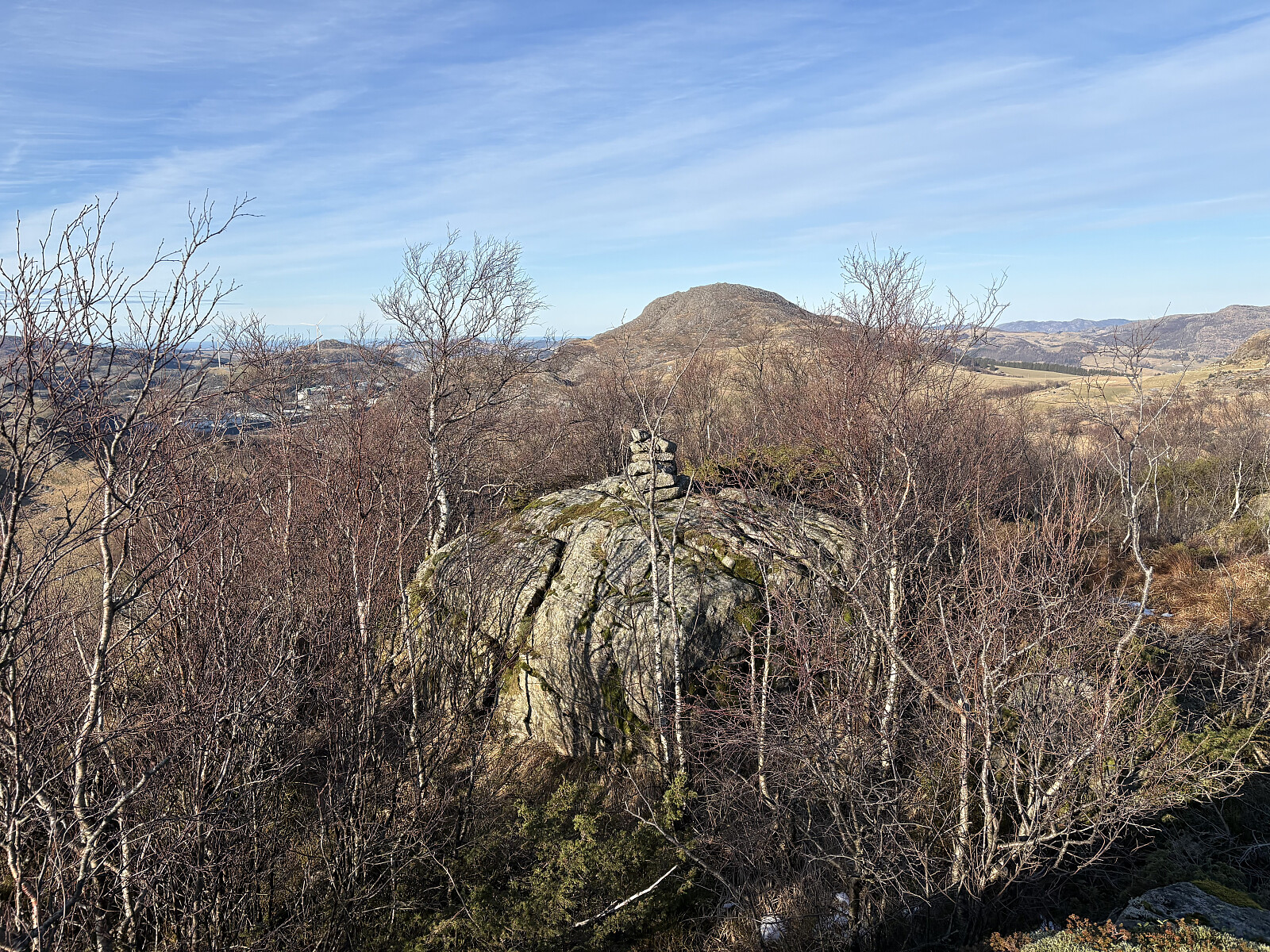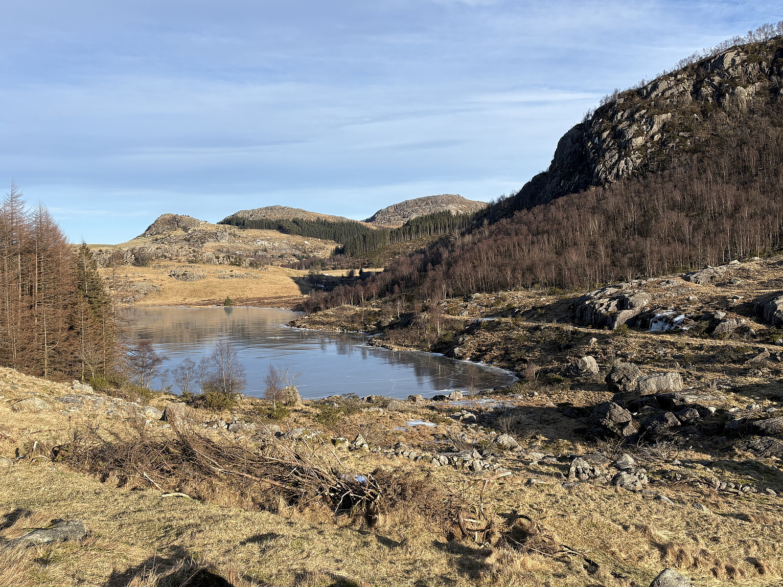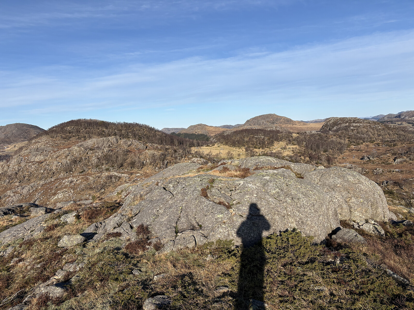Jeg parkerte på en lomme omtrent halvveis inn mot Skardsholen gård. Herfra gikk jeg på sørsiden av gjerdet og i lett terreng opp til Tøgjefjellet. Her var det fin utsikt og i tillegg fikk jeg fin oversikt over ruta videre. Jeg ville gå en runde og bestemte meg for å gå ned til Selstjørna og over Tjoafjellet fra nordvest. Turen ned til vannet gikk fint, bortsett fra et piggtrådgjerde som var litt stritt. Opp mot Tjoafjellet ble det noe klyving et par steder, men det kunne vært unngått hvis jeg hadde tatt en litt større bue. Utsikten fra Tjoafjellet var litt begrenset fra selve toppunktet da det var en del buskas der. Rundt på alle sider derimot var det muligheter for å se utover.