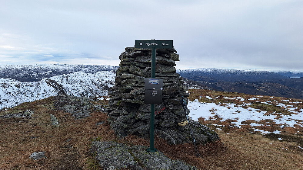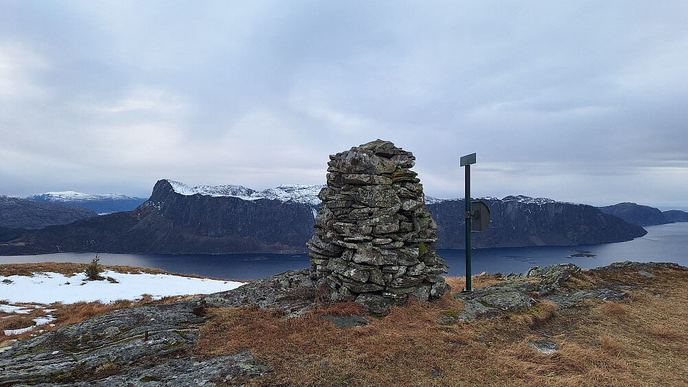 Satt lenge i bilen og vurderte om jeg skulle våge meg på en tur til. Kom på at jeg ikke hadde spist siden kl. 7, og bare litt mat kunne jo hjelpe på. Også synd å avslutte så tidlig på en så fin dag. Ved Øen kapell var det +6 grader. Valgte å ta med meg mye utstyr i tilfelle jeg måtte legge meg i dvale. Godt merket og tydelig sti oppover, og som normalt denne vinteren vestpå; mye is. Møtte fire personer på vei ned som jeg dels fulgte sporene til i snøen. Flere bratte kneiker opp gjennom skogen, og det ble mange pauser for å roe luftveiene og prøve å unngå å hoste da det ble veldig vondt, men etter hvert ble det slakere og lettere å gå. Flott topp med fabelaktig utsikt. Bitende kald vind i høyden, men på returen fikk jeg vinden i ryggen og kunne gå og nyte panoramaet utover Åfjorden og Gygrekjeften på motsatt side.