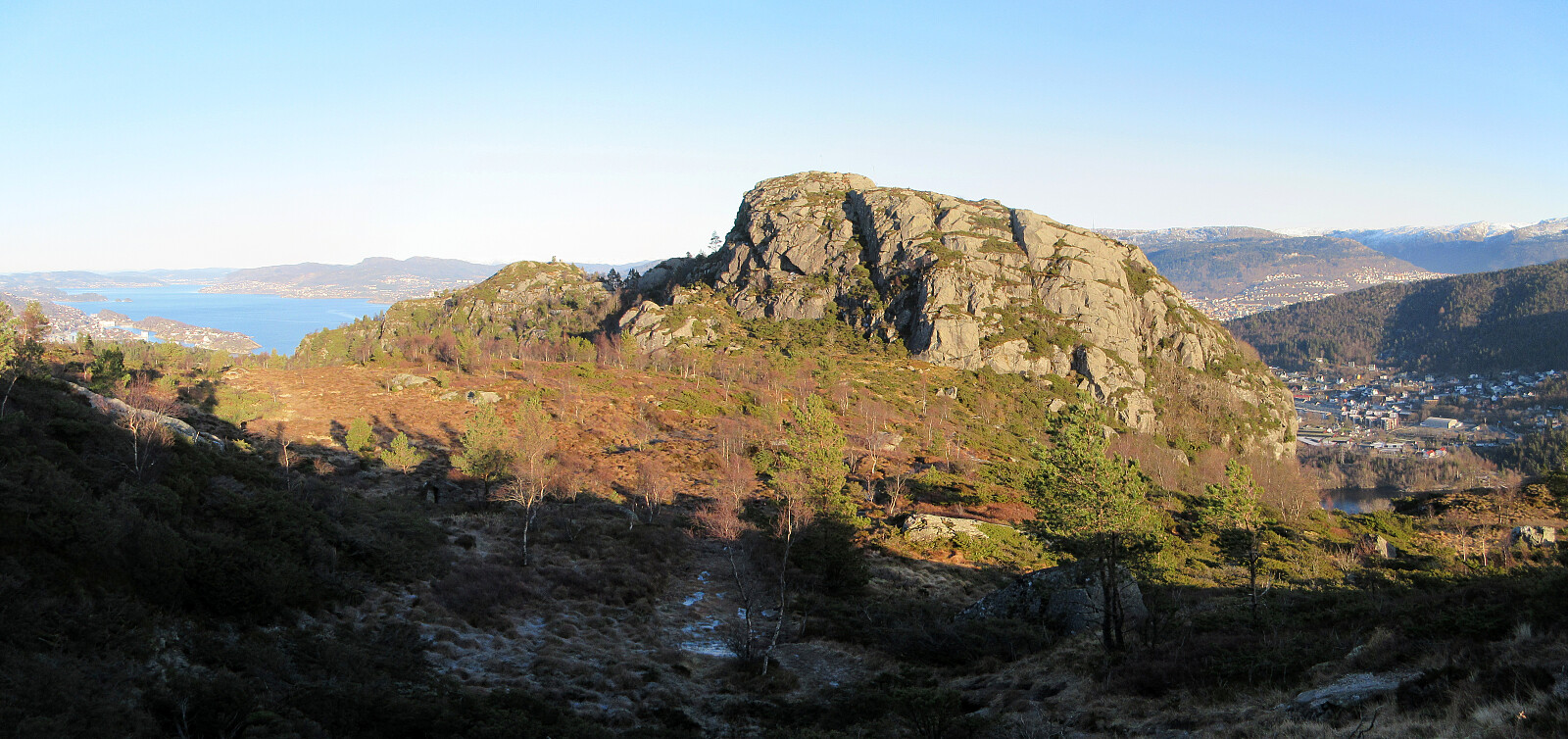 We aimed at some nice excursion, not too far out, and chose Ørnafjellet, i.e., the little sister or brother of Lyderhorn. To get there, we decided to park near Nedberget at Kjøkkelvik and hike up from there. The ascent through the forest was just fine, even though there was quite a bit of ice (especially in the rather narrow part before reaching the heights). Once up, we then started to surround Skåleviksvatnet in order to get over to Ørnafjellet and ascend it from the north. After visiting Ørnafjellet, we continued our little round on the heights to Skjenafjellet. There, we decided that including Lyderhorn, also, was just the right thing to do. After visiting Lyderhorn, then, we just walked back down to Nedberget to complete the hike.