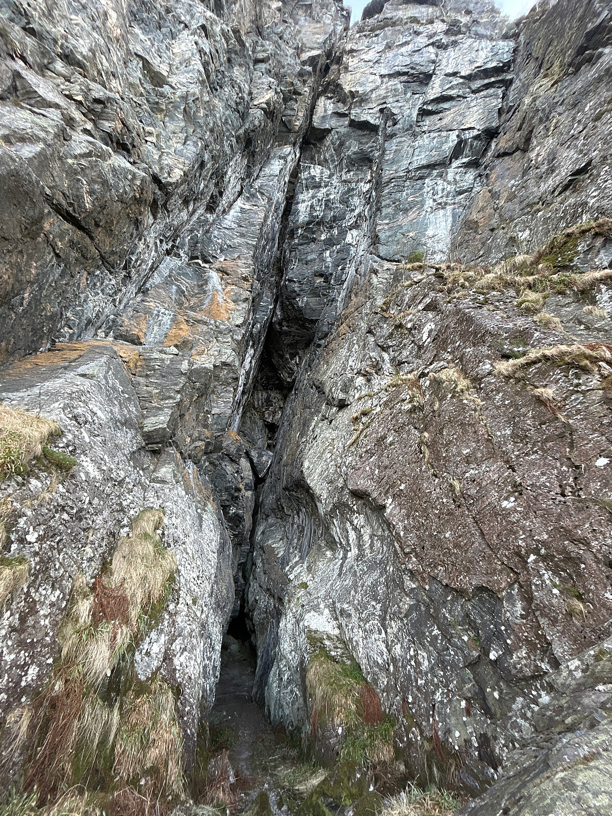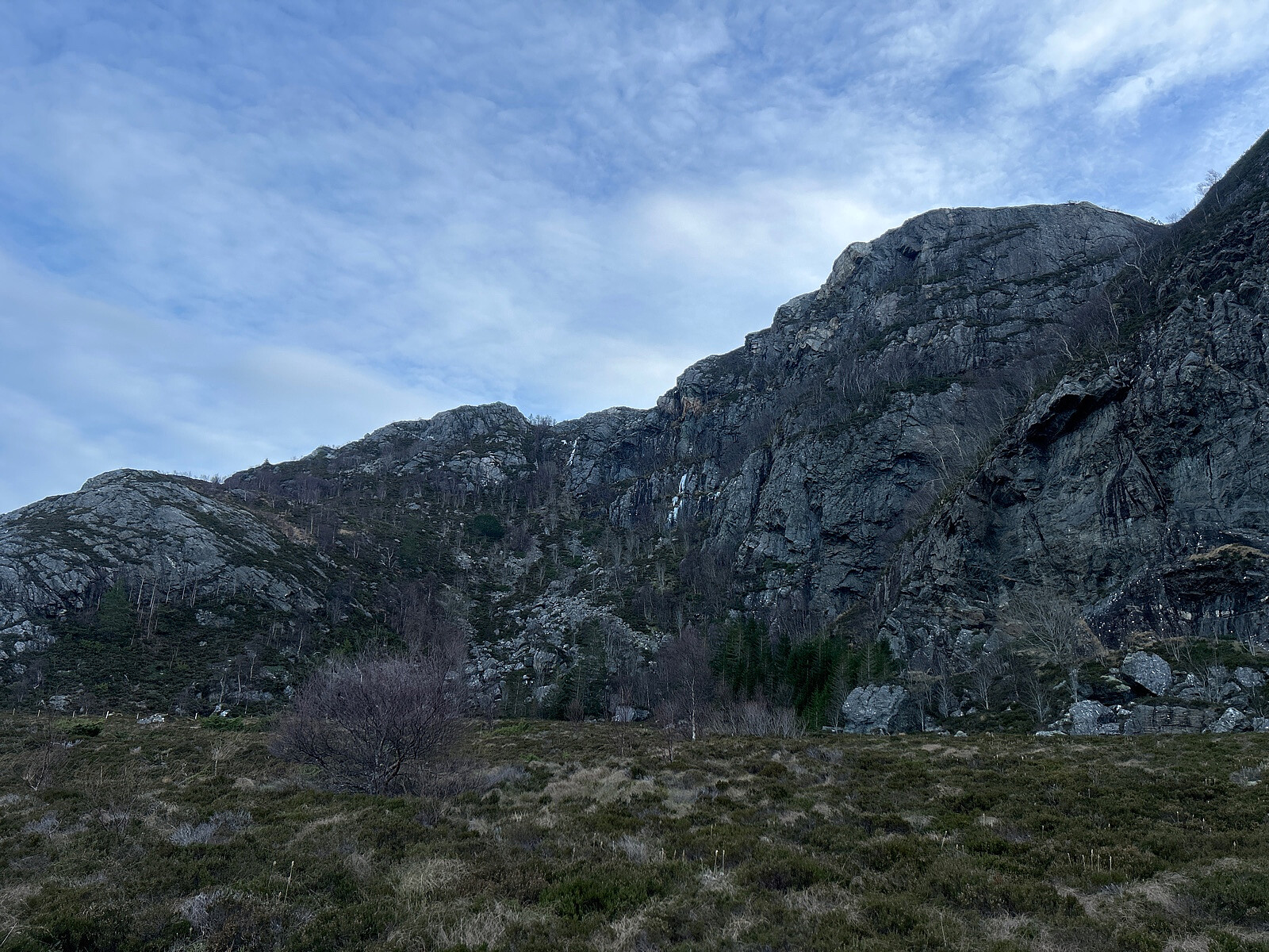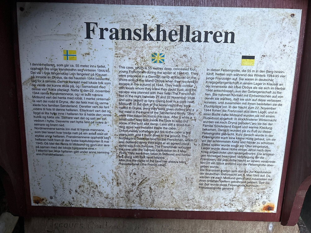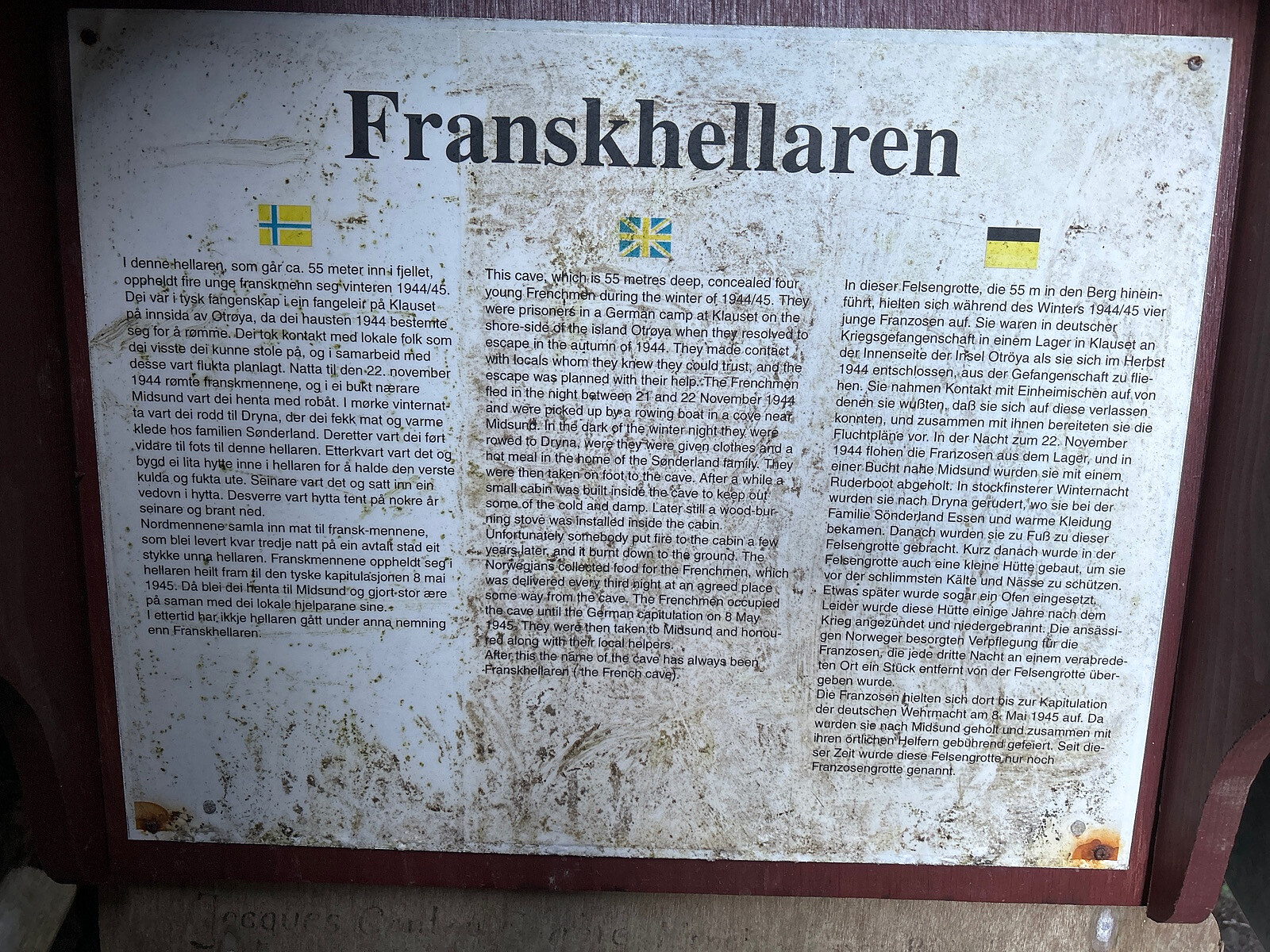 Etter ferjeturen parkerte jeg 30 meter fra ferjekaia og trasket oppover en god sti helt til topps på Dryna. Det var spesielt fint å gå nå, med hardt underlag pga frost i bakken, bare man passer på å holde seg unna stedene med stålis. Returen ble lagt på nordsiden av Dryna hvor jeg også besøkte Franskhelleren. Der møtte jeg en hyggelig mann på 88 år som fortalte historien om fire franskmenn som brukte helleren som tilfluktssted under krigen etter at de hadde rømt fra tysk fangenskap.