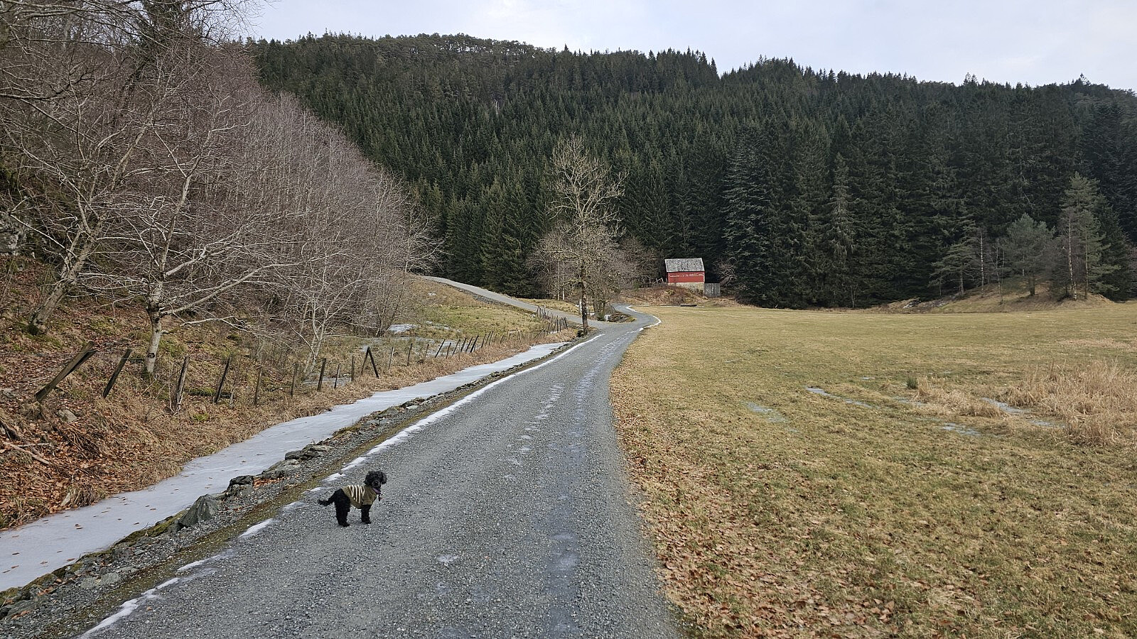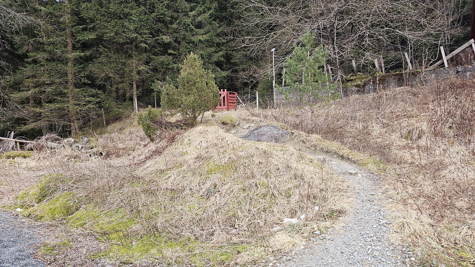 Jeg gikk opp stien som startet ved det røde huset, men valgte veien ned igjen, den som går opp til venstre på bildet