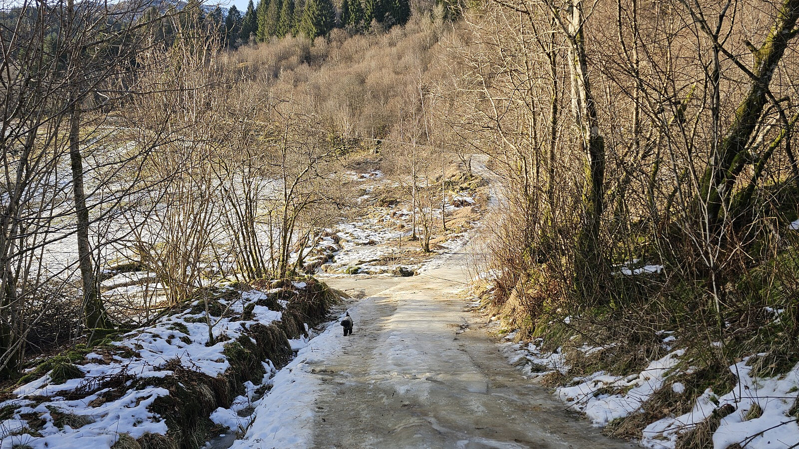 Puddern mente det var for bratt og ville snu. Den lot seg heldigvis lokke med en godbit, og jeg løftet den opp noen steder i ura