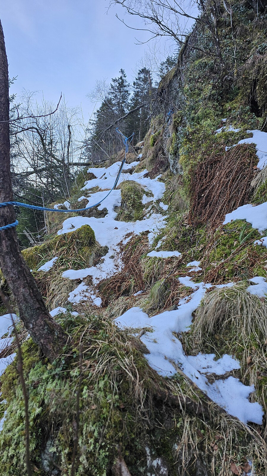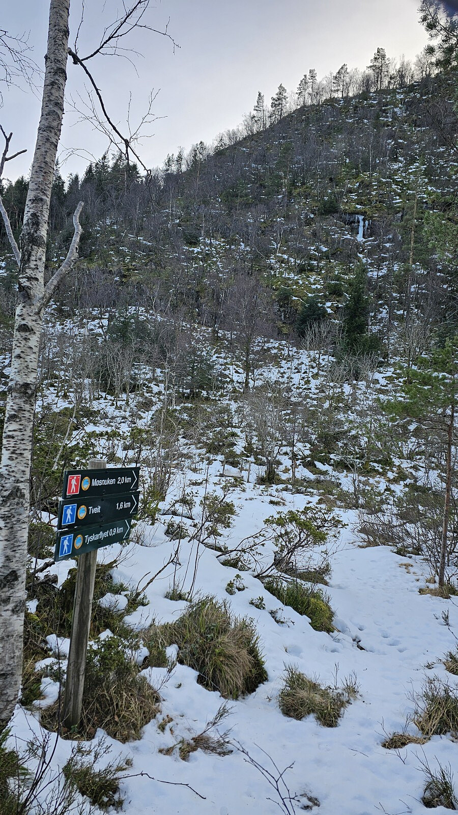 Ikke så lett å se stien, men det var skiltet når den skiftet retning og den var blåmerket i starten