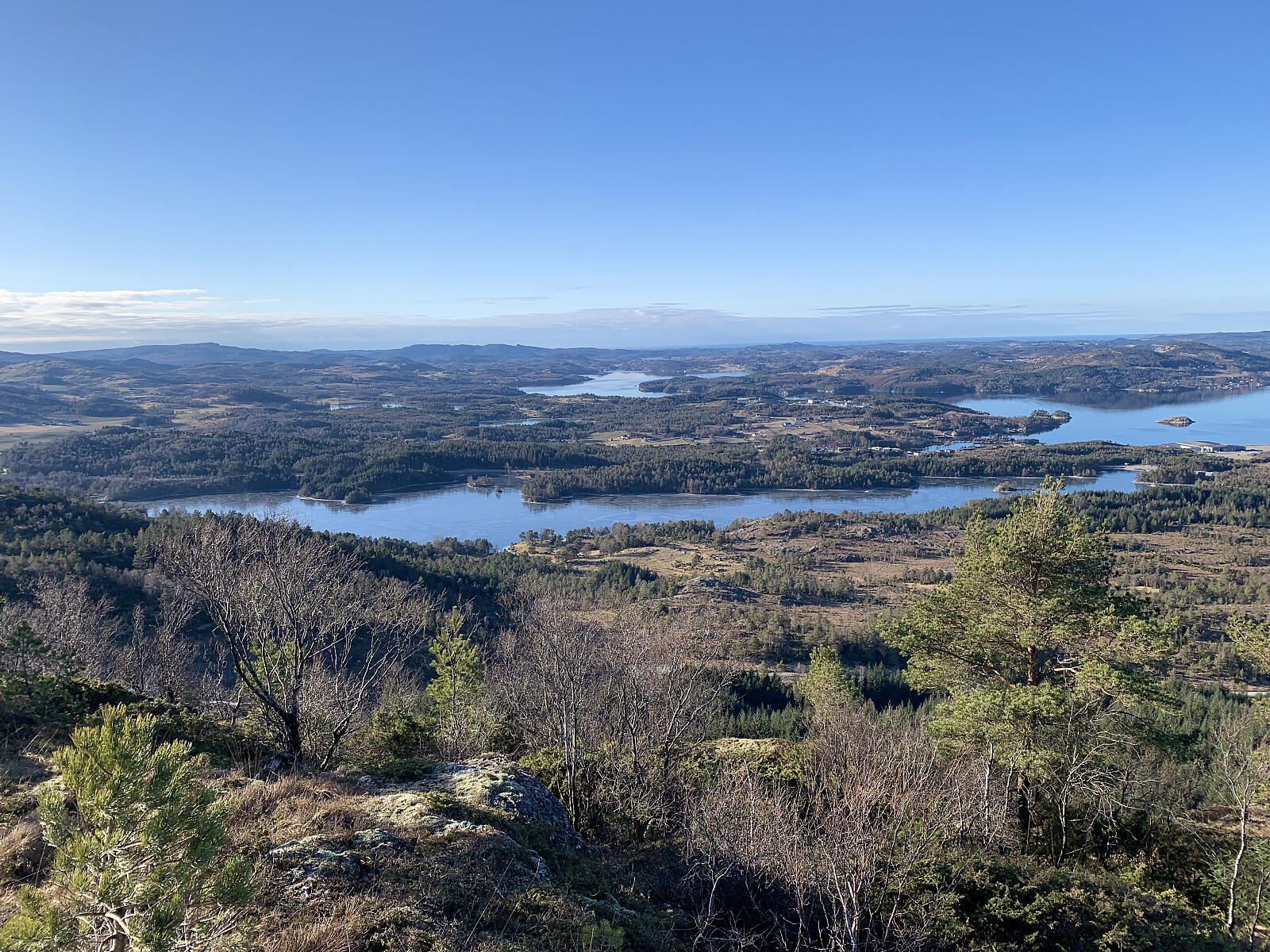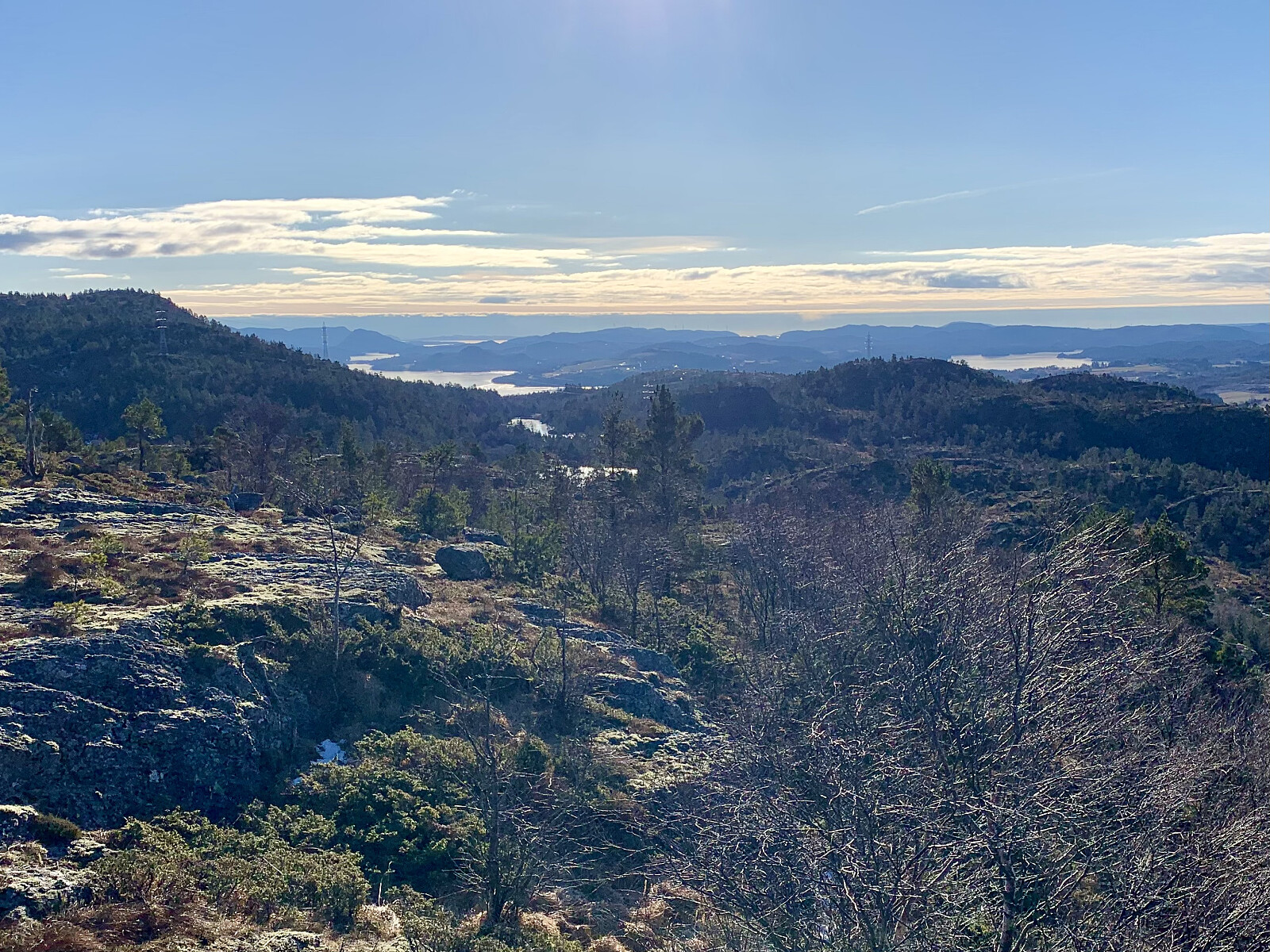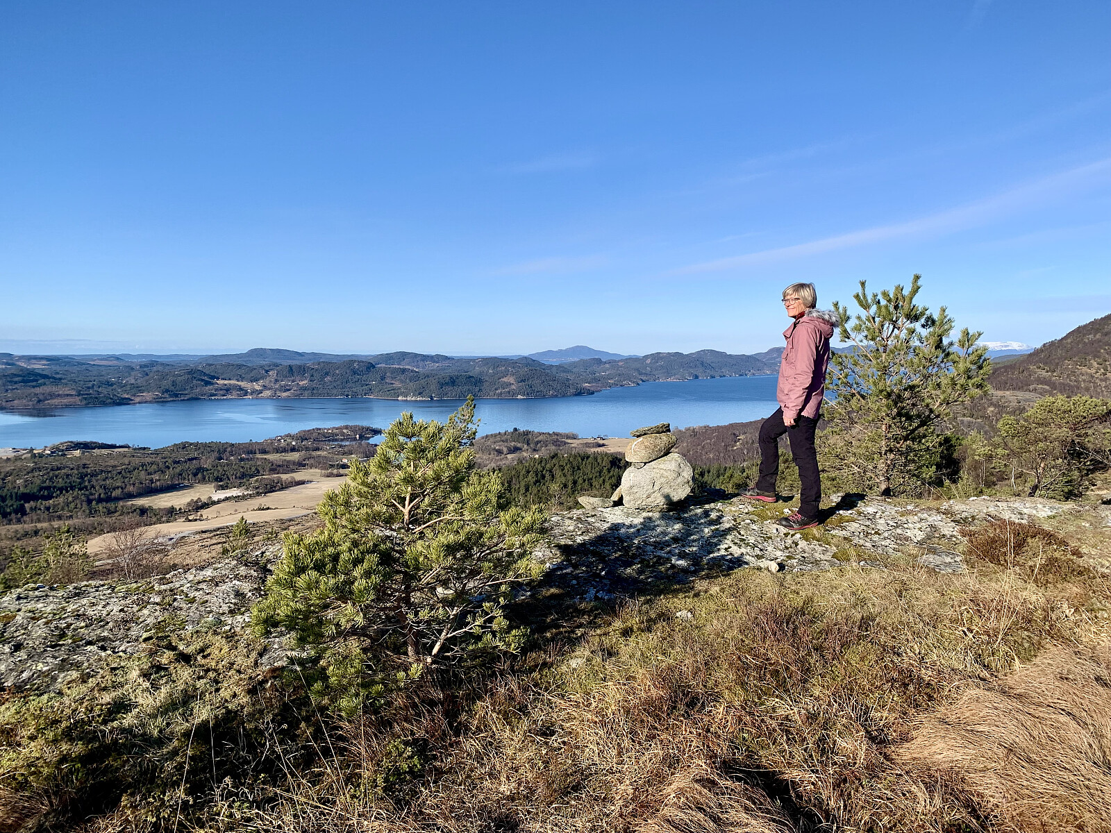 Vi parkerte på en parkeringsplass på toppen av veien før nedkjøringen til Bjordal. Like ved var det ei grind og en gjerdeklyver. Vi gikk over her og så 100 meter nordover på skogsveien. Der gikk vi til høyre ut av veien. Det var et ganske tydelig tråkk og en del nødlinger. Fjellet har en kant mot vest, og det gir en flott utsikt.