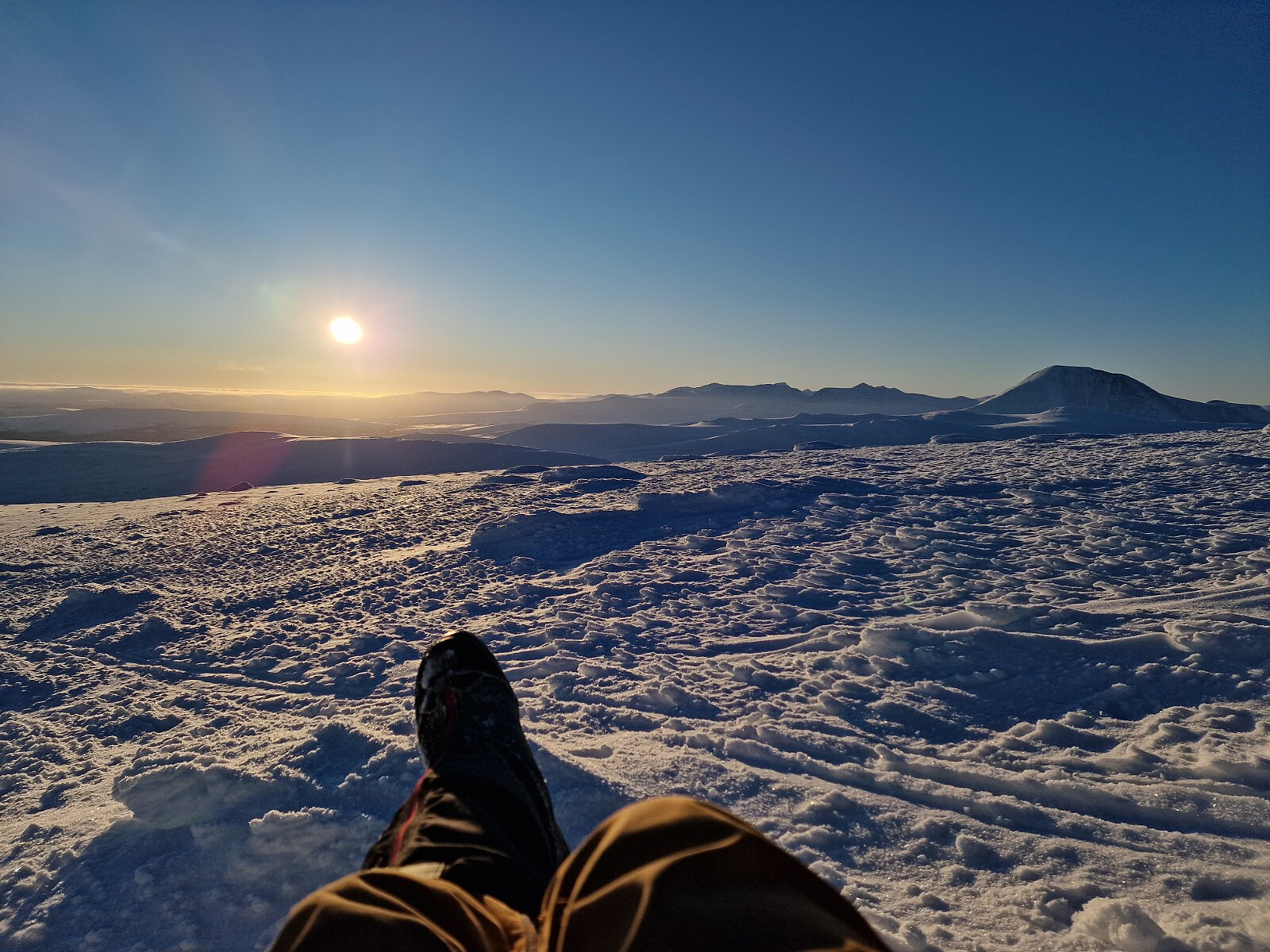 Rast i sørsiden av varde/topppunktet. Det var bare en trekk i lufta, og sola varmet.