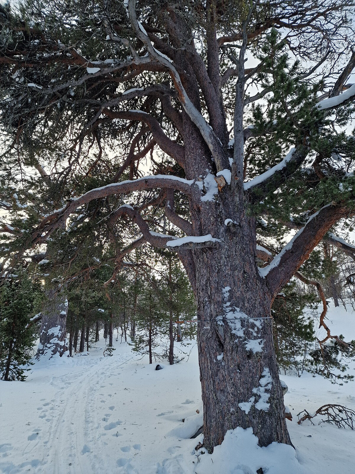 Jeg fulgte Øykjeklettbekke et stykke innover. Plutselig stod det to gigantiske furutrær langs stien. Jeg hang opp staven på det ene treet for å vise hvor gigantiske de var. Staven er 155cm lang,
