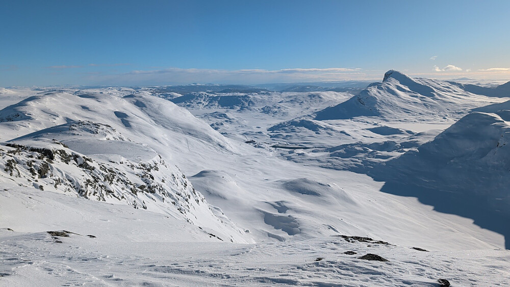 Med Morten. Mye løssnø tråkking, god trening. Små ras rundt omkring. Er spesielle forhold i noen heng og flanker nå der vinden harr tatt. For mye løs snø til at vi fikk ordentlig dreis på nedkjøringa. Skulle hatt brede pudderski i dag.