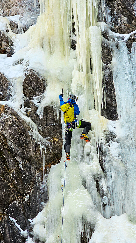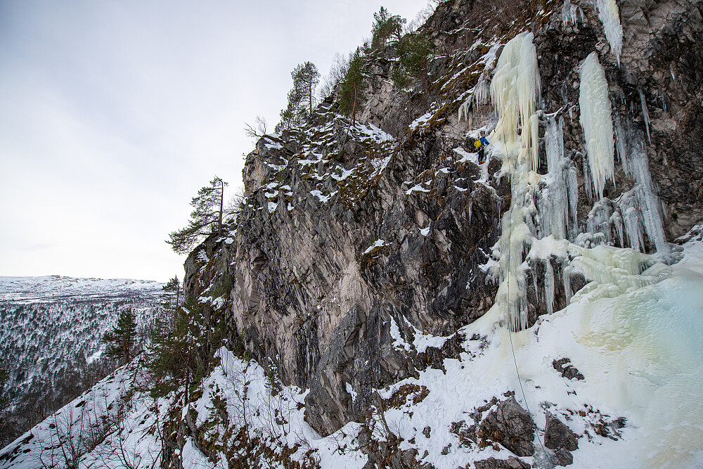 Etter tips så jeg og Alf for oss ei ny linje i Gjøra som vi gikk for. Isen var hard og tørr i første taulengde (WI3+). Lengre oppe ble isen bedre. Cruxlengden graderte vi til en sterk WI4 mens siste lengde var WI4 på våtere is.