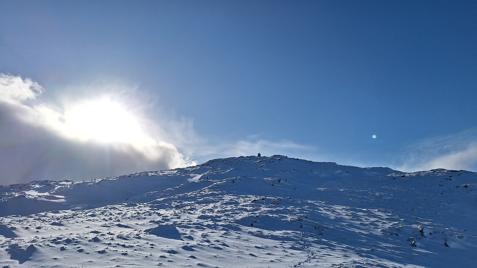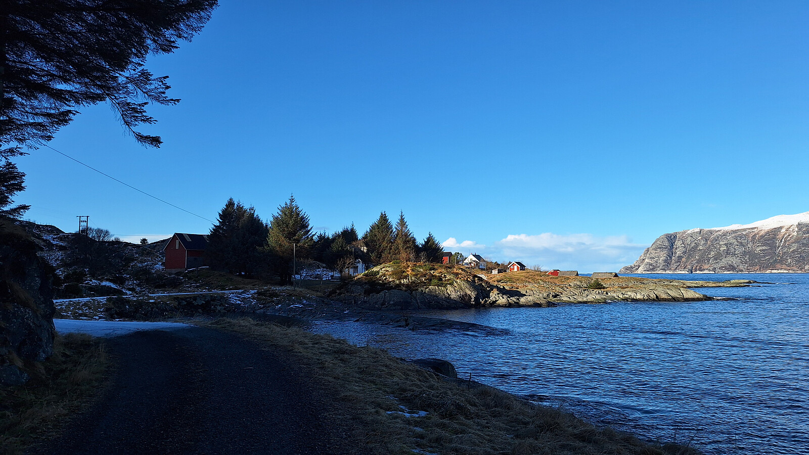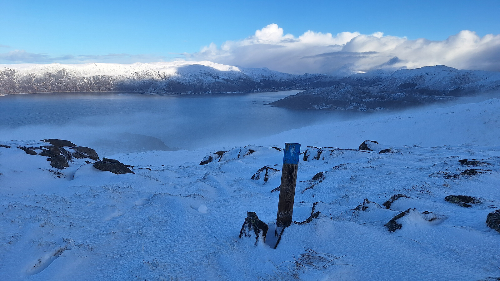 Parkerte ved ei hytte før grinda parallelt med Nørdre Olderøyna. Veien utover var ikke brøytet og tidvis svært isete og glatt. På avstand så snøforholdene på Fanneskarvarden greie ut, men det ble fort veldig mye snø oppover, ca. 20 cm fra 300 moh. Klarte å holde stien sånn noenlunde ved å følge blåmalte pinner. Til å begynne med var det våt snø og isen under var i oppløsning, og det ble temmelig fuktig. Tørrere snø i høyden med blankis under, men til gjengjeld dype fonner som måtte forseres, og da frøs bukse og sko. Siste stykket opp var det mer avblåst. Fikk en heftig snøbyge fra ca. 300 moh. som fulgte meg til topps, men akkurat da jeg skulle til å gå ned igjen, letnet det like brått som bygen kom. Spennende kystklima. Hadde tenkt gå en annen topp etterpå, men siden det var så mye snø gikk jeg i stedet ut til Nesje og fyret der. En nydelig plass ut mot storhavet uten fastboende.