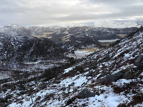 Det var litt vanskelig å finne en egnet plass langs hovedveien, så jeg parkerte i en lomme langs Madlandsvegen. Herfra bar det rett oppover i en bratt steinur slik at jeg kom opp nord for Forefjellet. Ruta videre mot toppen gikk langs diverse tråkk/gjengrodde stier innover dalen og opp mot toppen. Litt nysnø i terrenget, men ikke mer enn at det gikk helt fint å gå til fots. Vid utsikt fra toppen men litt grått og overskyet denne dagen.