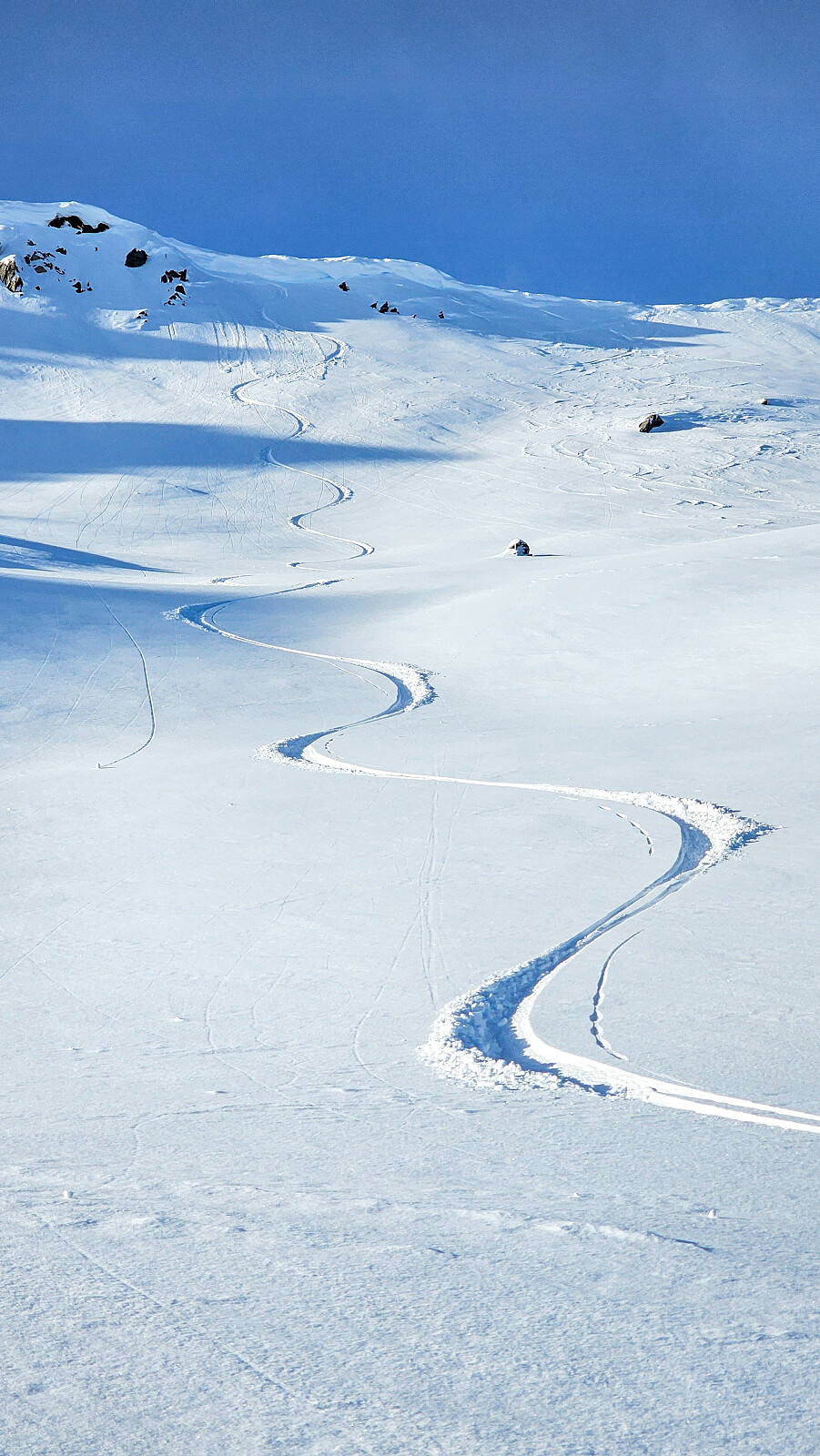Ikke mye snø over skaren i nedre del, men godt med snø (50-70cm) i hele hengområdet under Åbittinden. Kunne droppe inn bratt på god og stabil snø. Flotte forhold ned fra østryggen på Trolltinden, men her var det vesentlig mindre nysnø over skaren (20cm) så måtte kjøre litt mer konservativt.