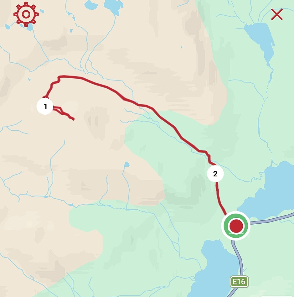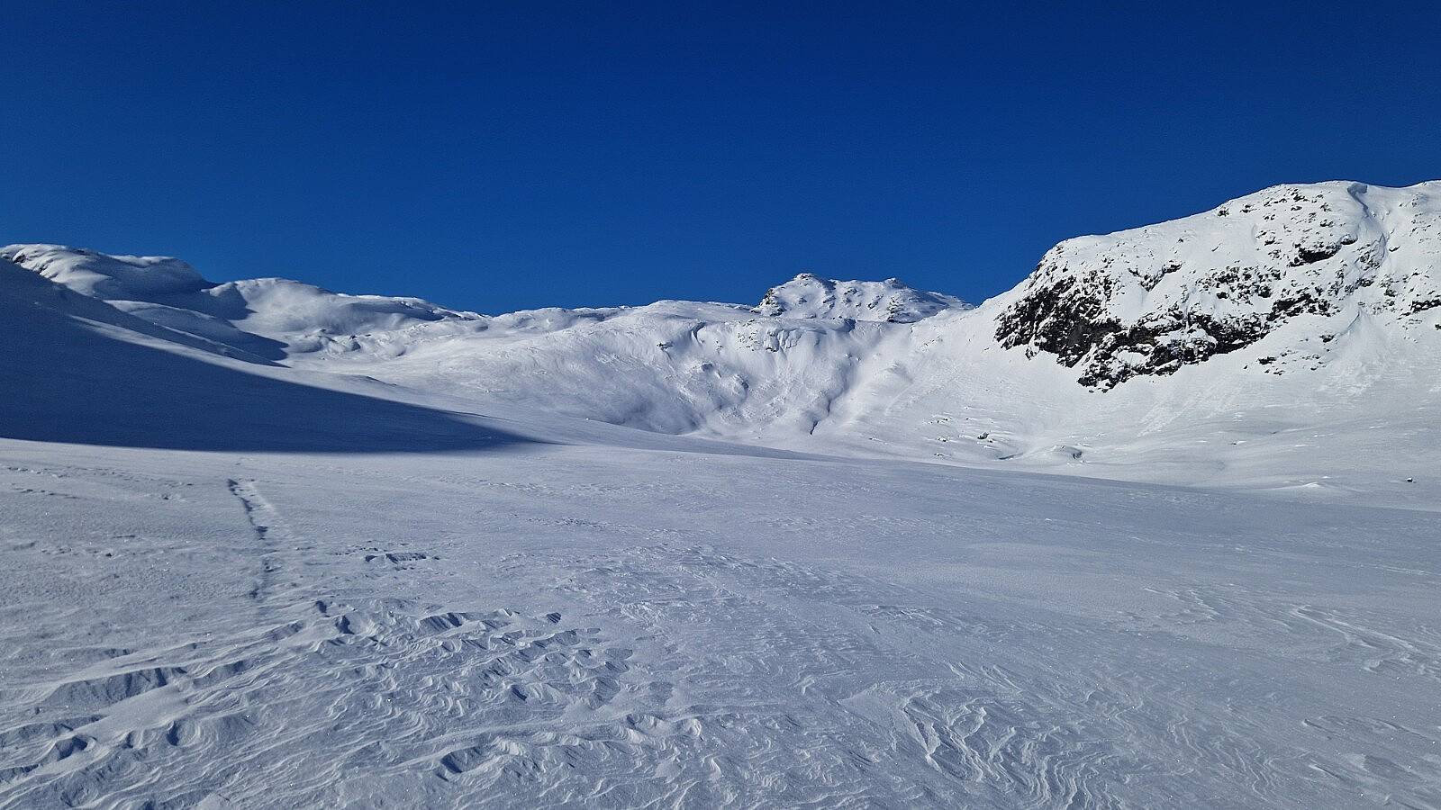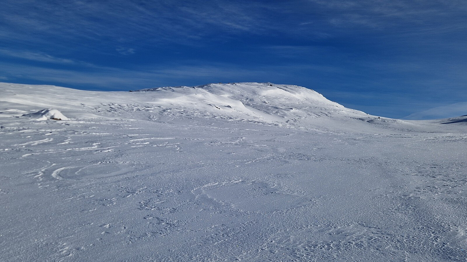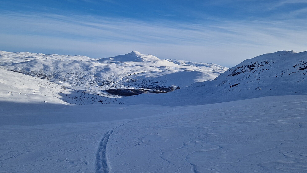 Min andre tur til dette målet i februar. Fin rute og flott landskap. Føret var litt spesielt. Snøvolumet er knusk-turt, men med litt papp-skare øvst. Ein søkk 20 cm ned der det ikkje er spor, og stavar går halvmeteren i gjennom, og utan å få tak. Godt då, at det var spor oppover, og litt inn i dalen. Men etter kvart måtte eg brøyte meg opp og inn Vesle Frostdalen. Inne i dalen, like under toppen, hadde det gått 4 sjølvutløyste små ras. Heilt klart stor skredfare i dag. Men ikkje ruta eg gikk. Heldt meg til trygge val og ikkje over 25 grader bratt i dag. Kraftige drønn høyrdest fleire gonger, og med sprekk i snøen som følge. Dette var på stader der det var relativt flatt. I stgninga frå fjellfoten og opp, var det litt fastare, og ikkje så strevsamt å gå. Ja sjølv om det no vart brattare. Knapt 2 timar opp. og vel 40 min nedatt. Strålande ver og fantastisk utsikt. Skulle ha gått ein time før for meir sol på returen. Peakbook-sporet surra men det var tillatelsar som var feilstilt av meg.