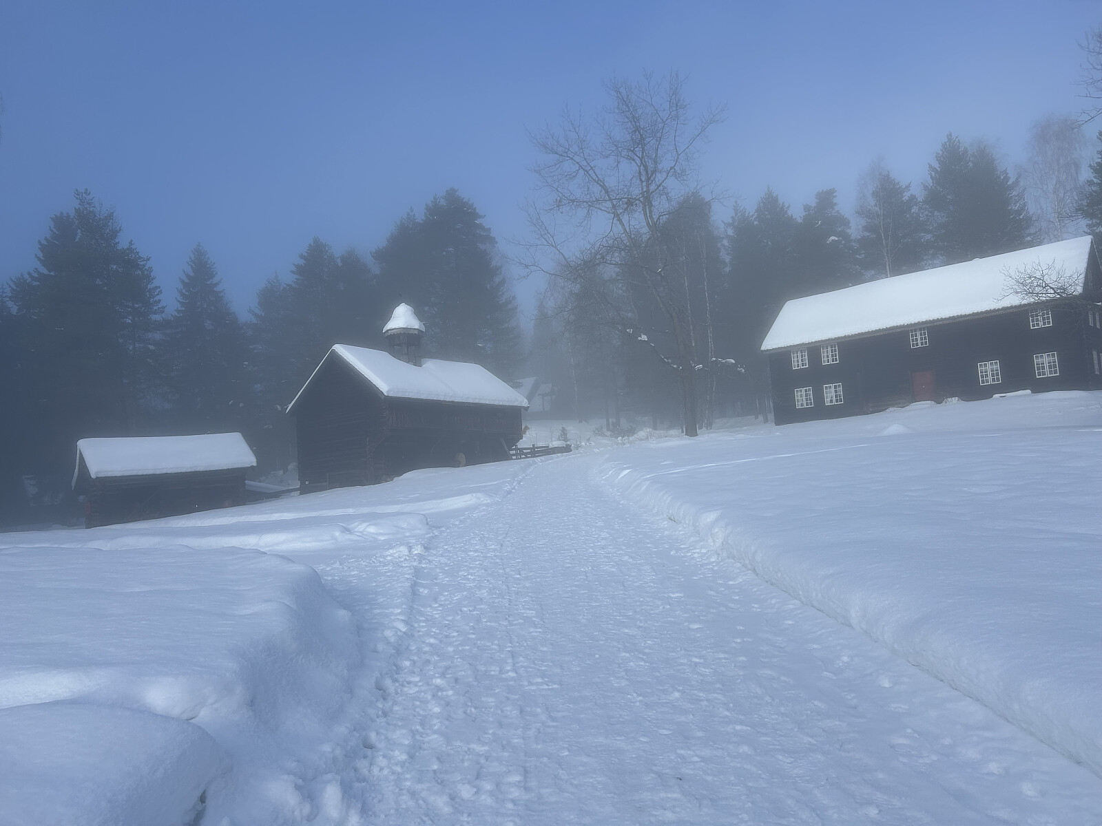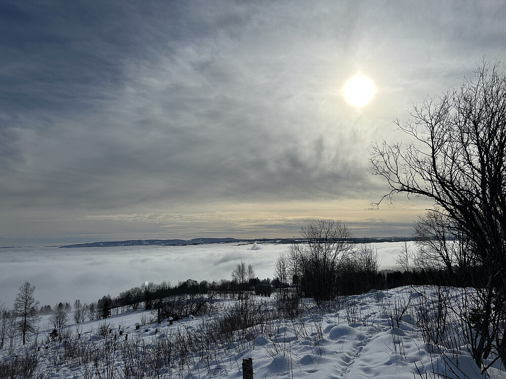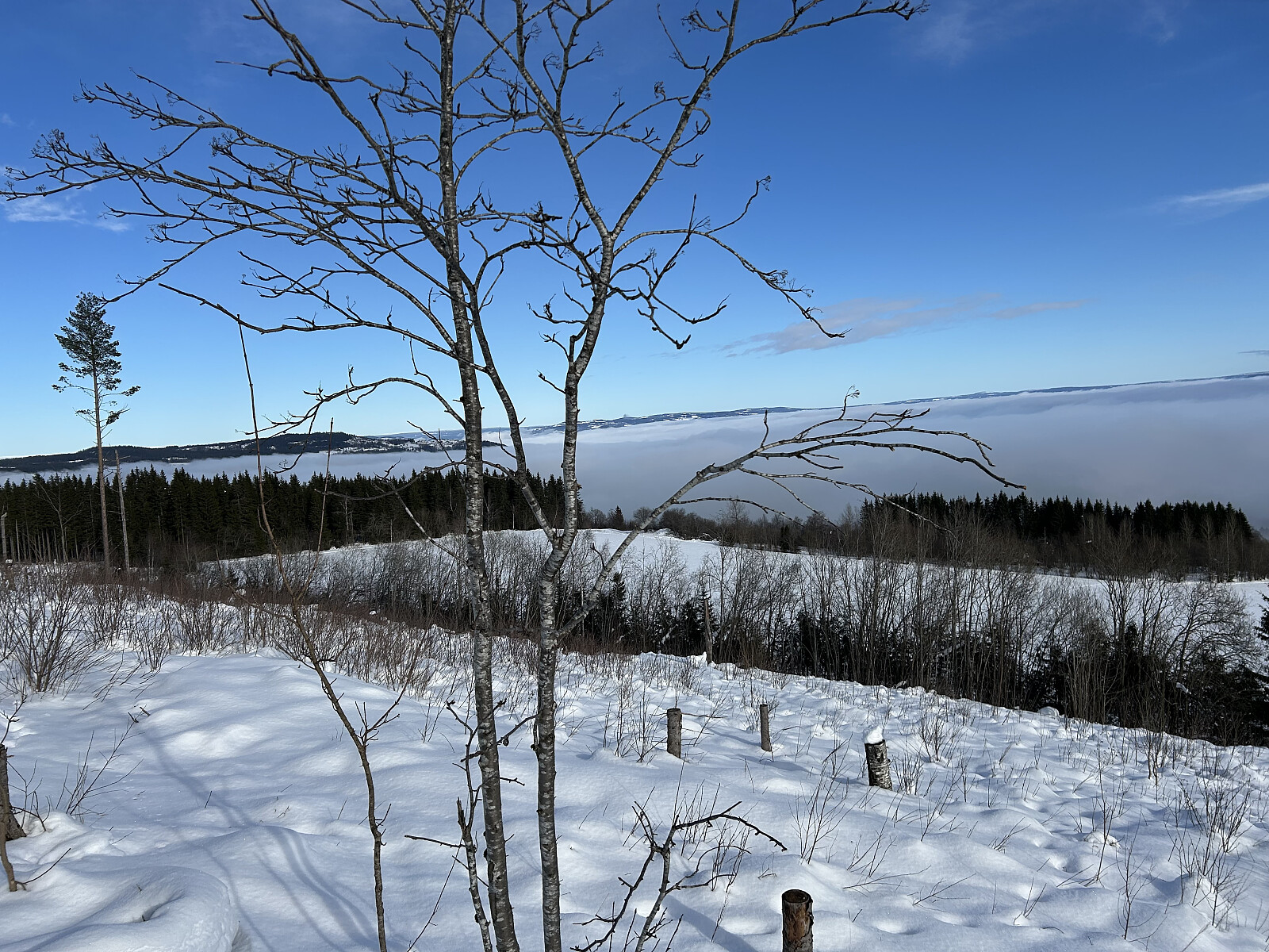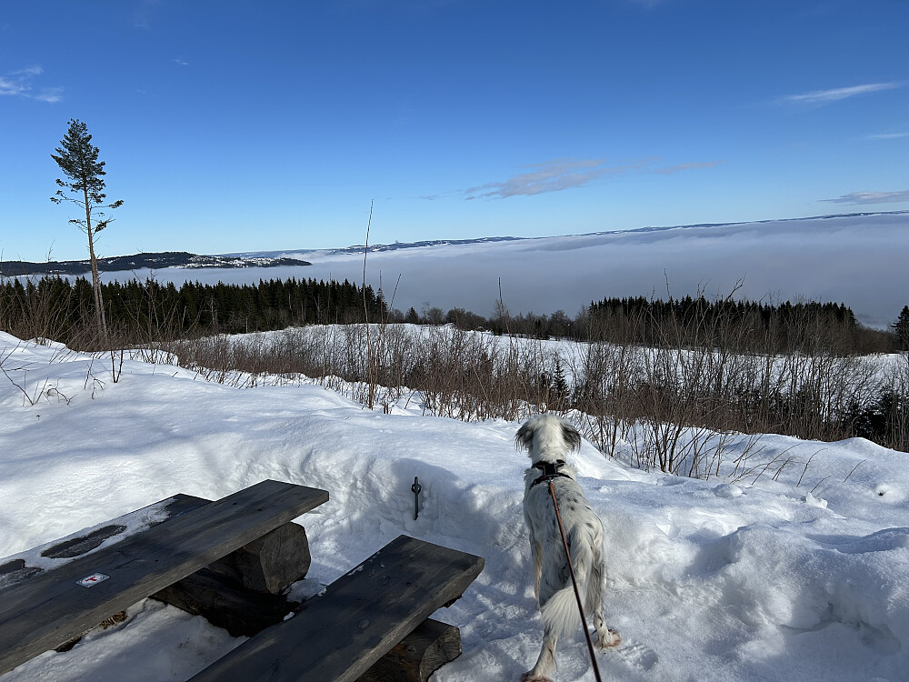 Tur hjemmefra med Trym. Tåke da vi gikk hjemmefra, men på Eiktunet nærma vi oss blå himmel.