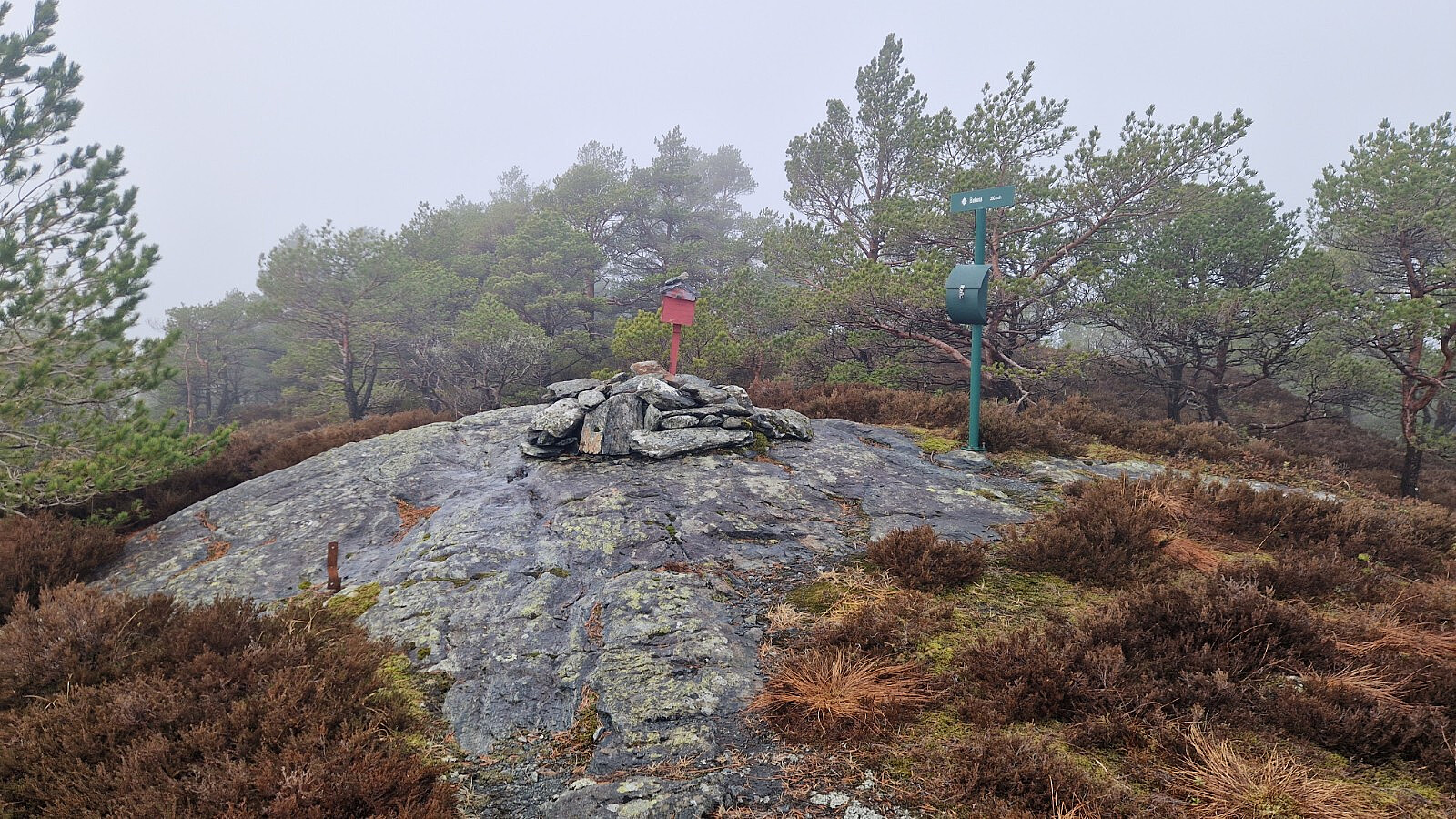 God sti, skilta og merka rute. Byrja på grusveg, så skogsveg, og sti vidare til topps. Svært blautt i stien. Skodde, og ingen utsikt så tidleg på dagen etter regn dagen før. God trim og dagens andre raude nål i Hyllestad.