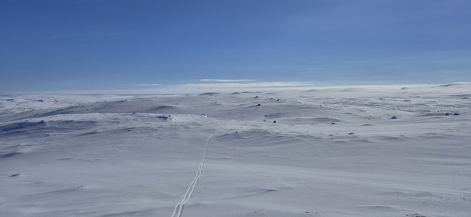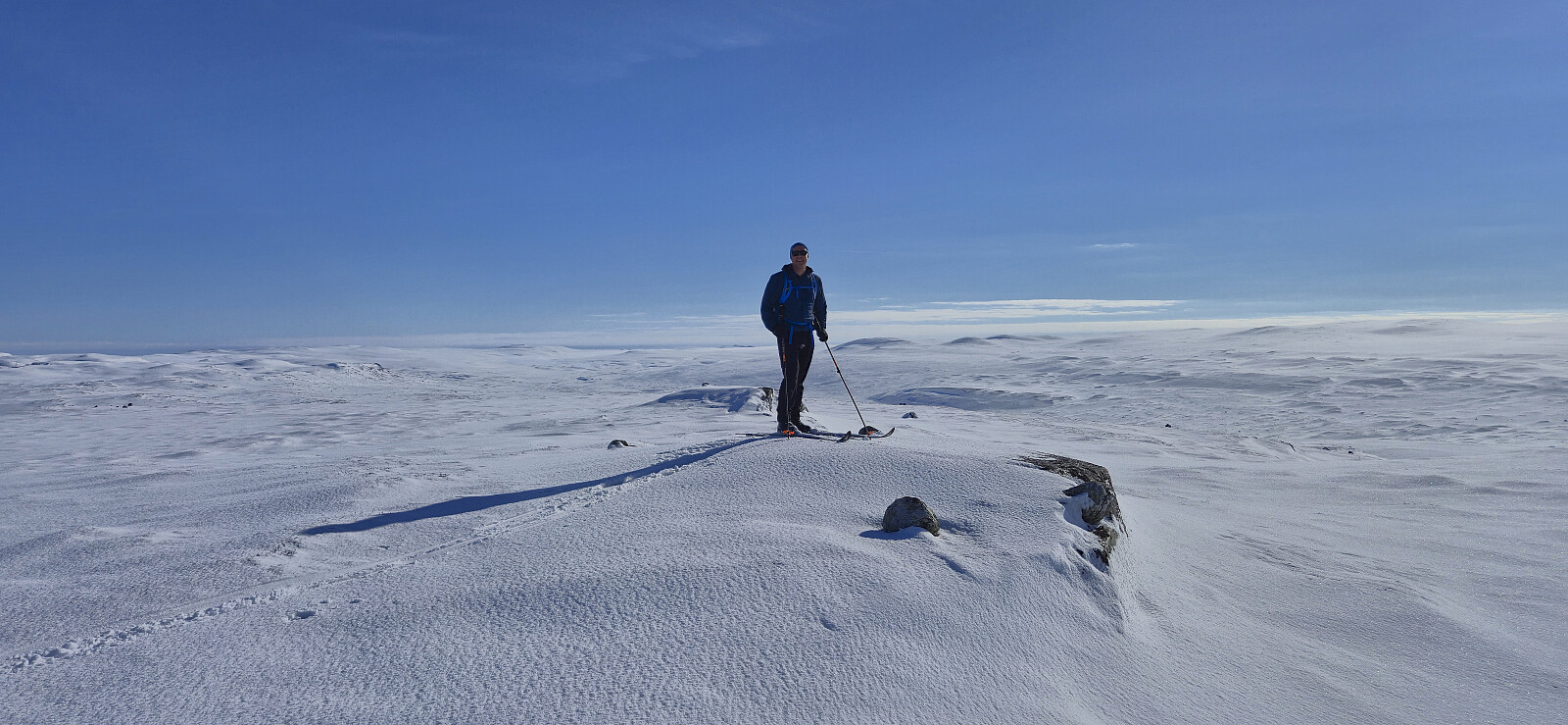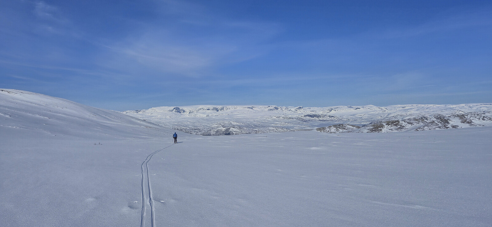 The ascent to Vetle Allgarden was a mixed bag. It started with a minor struggle in deep and heavy snow which later turned into areas with almost no snow at all. After another break at the summit, we headed more or less in a direct line east, aiming for the dam across Bjoreio, and finally concluded the hike by walking the short distance along the main road back to the car. We had also planned to ascent Grytehorga but given the sub optimal skiing conditions, we left this for another day.