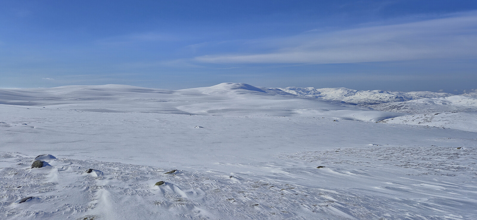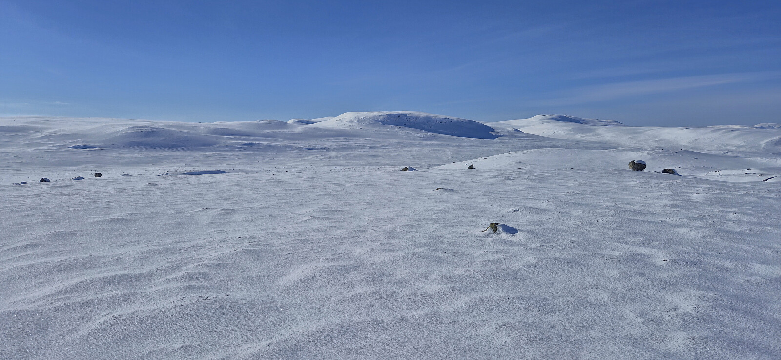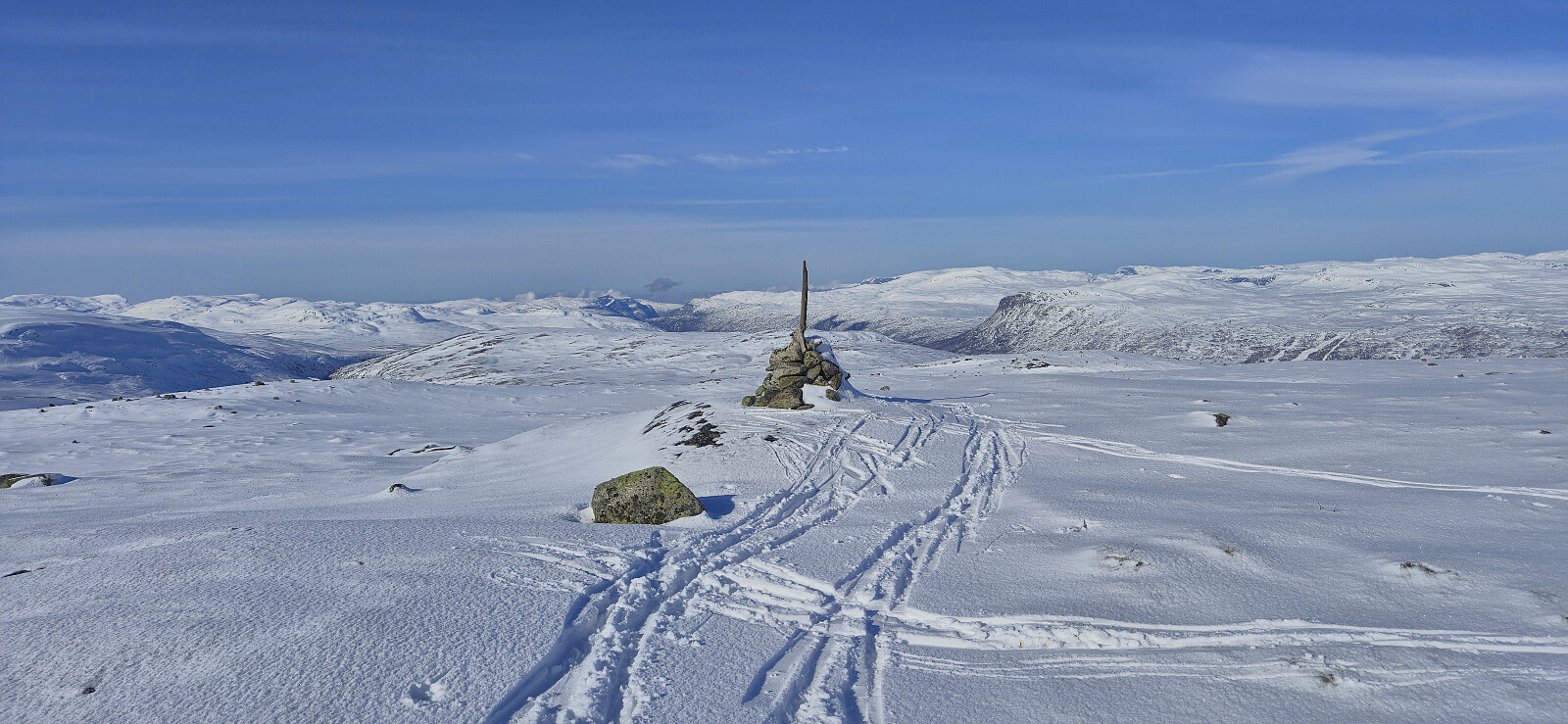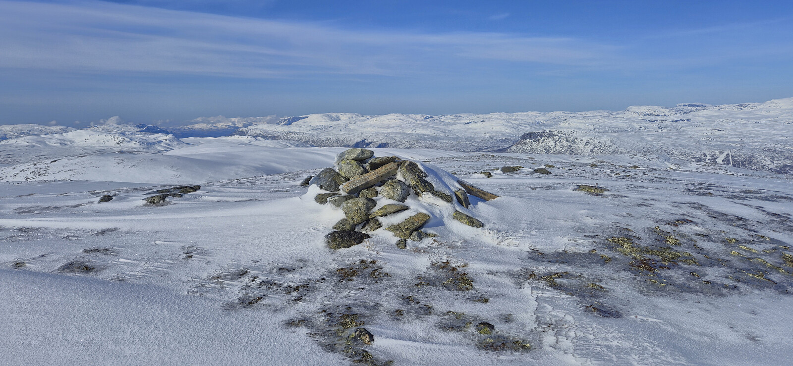 After a long drive from Bergen, most of it in very dense fog, we could finally leave the poor visibility behind shortly after beginning the ascent from Eidfjord and when parking the car next to the road north of Store Bjoreinuten the sun was shining from an almost cloudless sky. After crossing Bjoreio we easily made our way to the highest point of Store Bjoreinuten, passing by the old northwestern summit marked by a small cairn on the way.