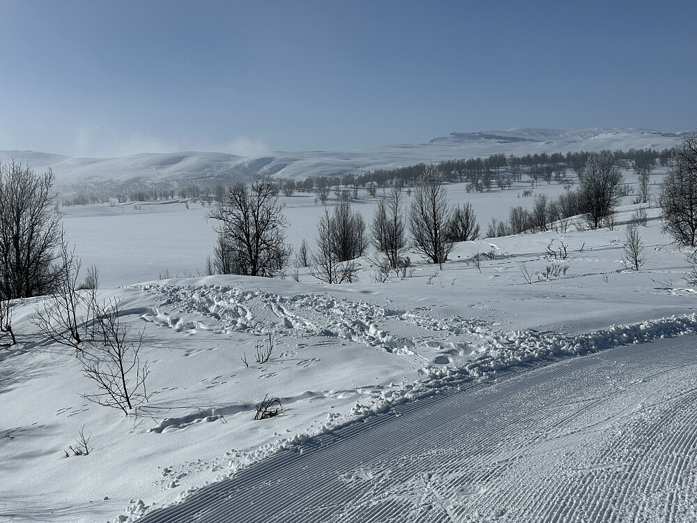 Skitur fra hytta sammen med Anders, Storm og Trym. Vi starta i overskya vær, men det letnet snart, og sola kom fram. Vi passerte Jentfjellkrysset, og tok av mot Leppskardet. Her har løypemaskina kjørt inn over flata, og opp et par bratte kneiker, før det blir for bratt, og den snur. Her møtte vi en vegg av tåke, som lå i skaret, og ned på begge sider. Tungt opp den bratte bakken til vi sto i Leppskaret, dessverre med null sikt. Herfra fin nedkjøring til Leppe, der tåka begynte å lette, og sola kom fram. En kort rast før vi fortsatte til Ongsjølia, og tok Vetafjellet rundt løypa tilbake til hytta.