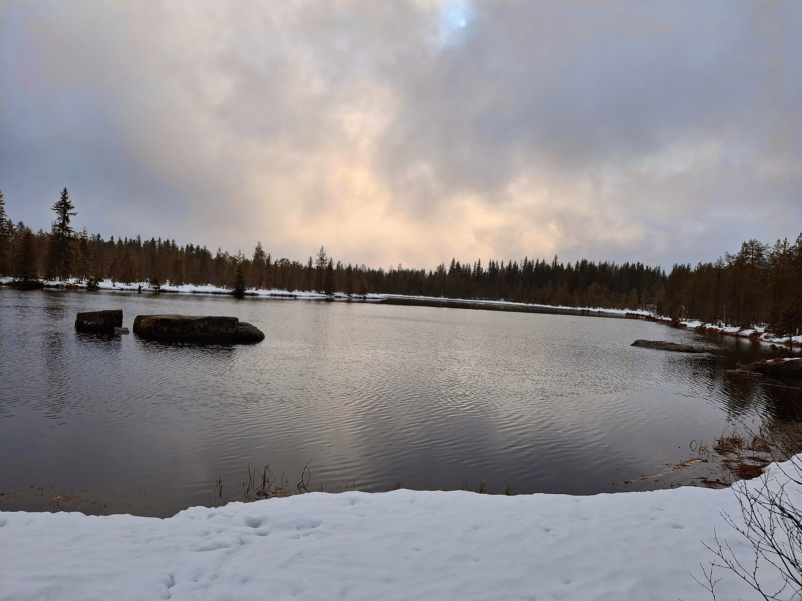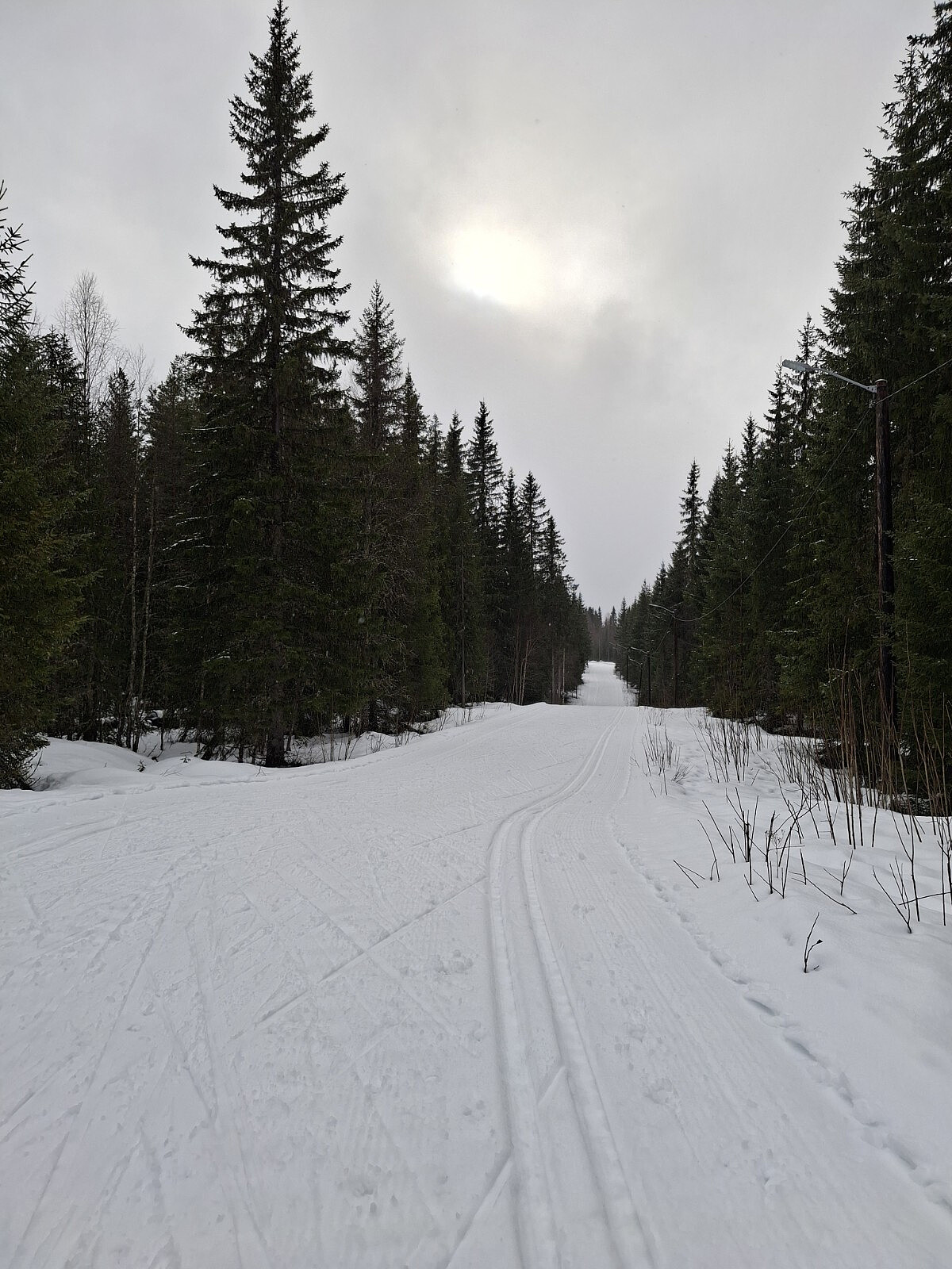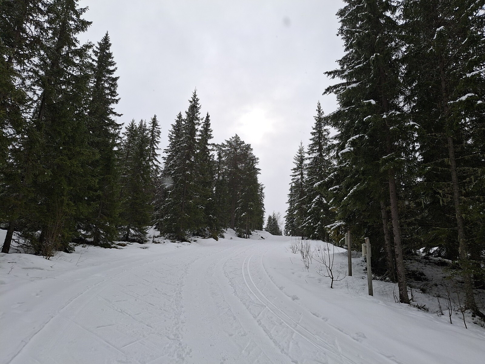 Grått, lett snøvær, glimt av sol. Nykjørte løyper i stadionområdet og lysløypa. Litt mer slitsomt i Birkebeinerløypa og ned til Bottilmyra der det var ca. 10 cm tung nysnø.