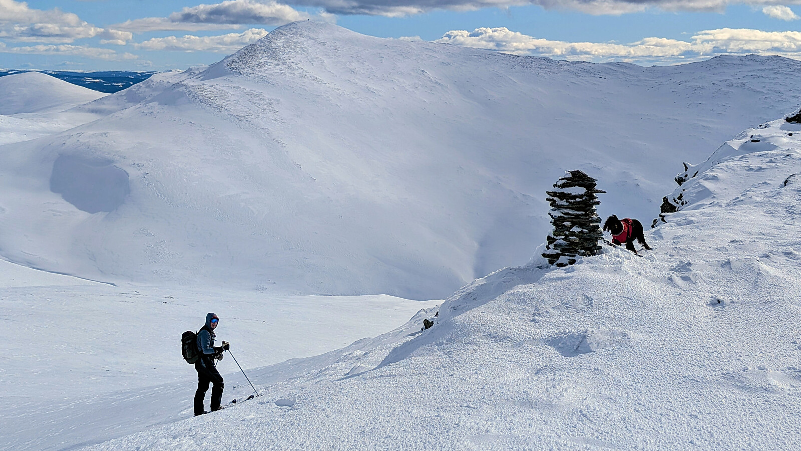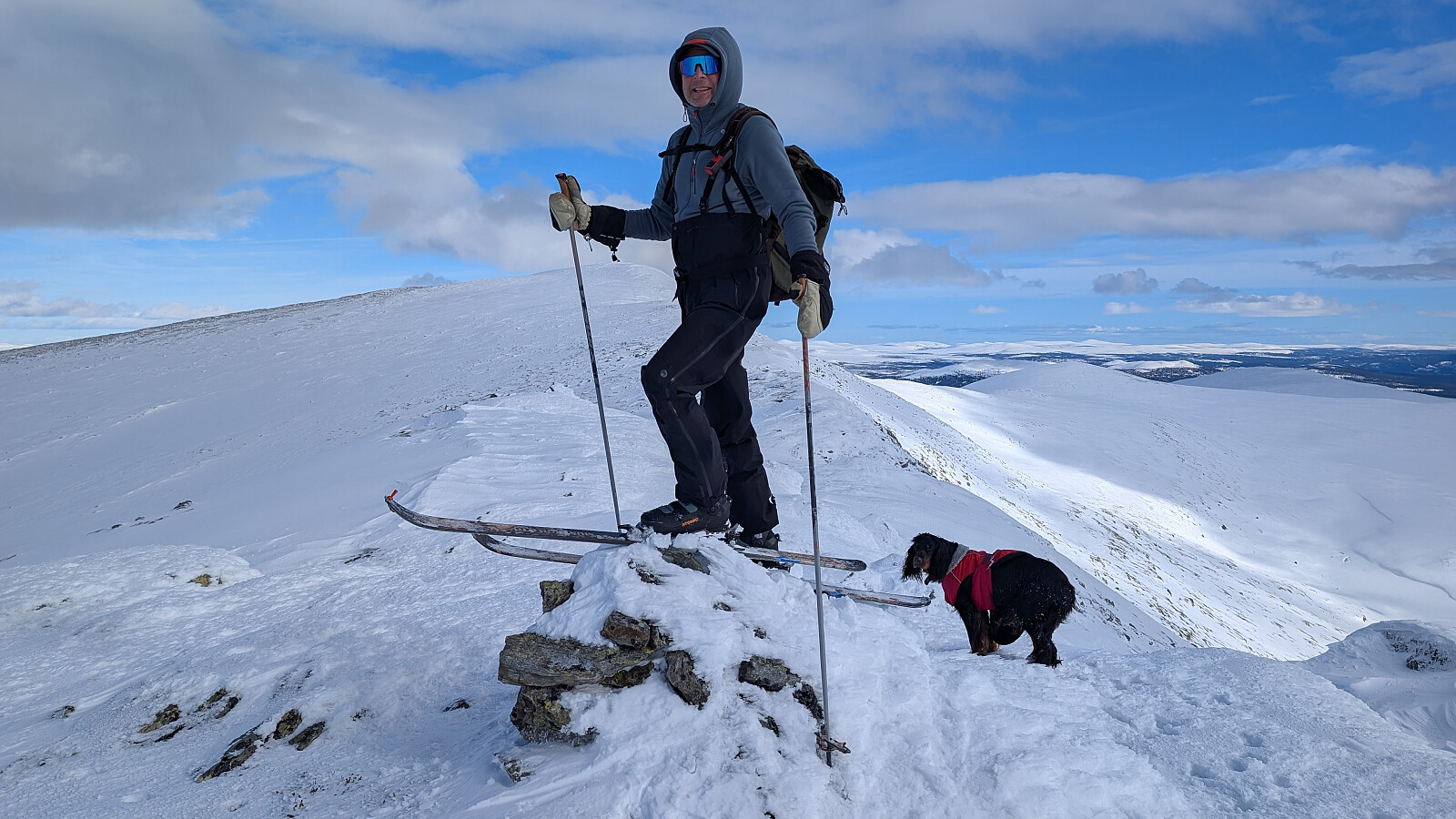 Vel nede og en god pause nede i skaret var det igjen en dryg bakke å forsere. Greie forhold oppover mot Gråhøa og med mye bedre forhold nedover mot den siste toppen....Gravhornet. Meget imponert over Embla som løper etter oss. Ikke enkelt for henne med tynne bein som trår igjennom oppe på fjellet og så i dyp snø i det lavere terrenget der det var råtten snø. Hadde en større operasjon tidlig i februar, men still "going strong" over 12 år gammel. En tøff tur dette.