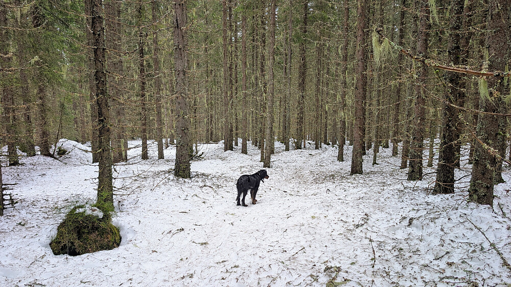 Værmessig burde jeg nok ha valgt et turmål litt lenger nordover idag. Det er ikke for ingenting at Totenåsen er et snøsikkert sted. Det er tydelig at her oppe er det ofte "vær" Også idag var det snøvær mens noe nord for Gjøvik var det svak sol. Vel,- ble en grei treningstur. 400hm på truger på noe over 2 km blir ei grei økt. Noe crispy og hardt inne i den tette skogen. Mye brask på bakken. Noe lengre opp fin trugetrase og også utenfor den var det ganske faste forhold. Det var vel snaut 5 cm kram nysnø på over 750 m. Turen burde jeg nok ha tatt seinere på dagen da sola kom seinere. Tur med Embla.
