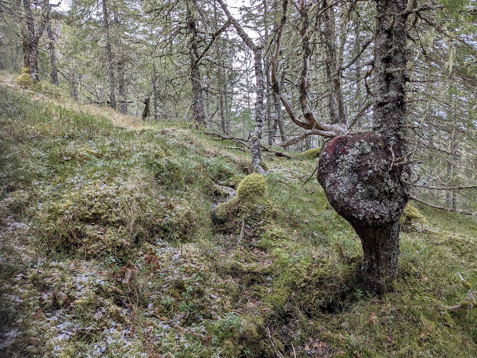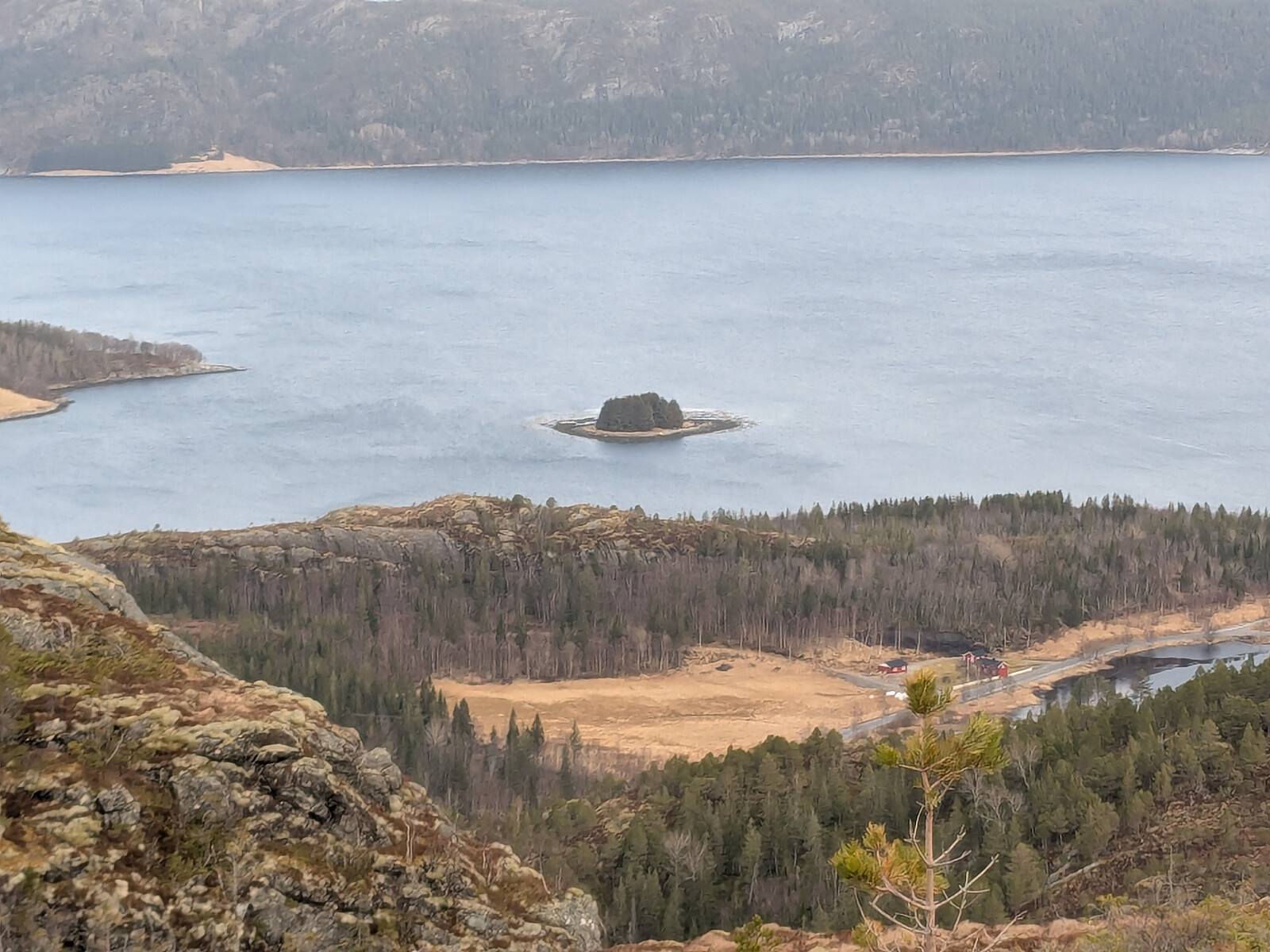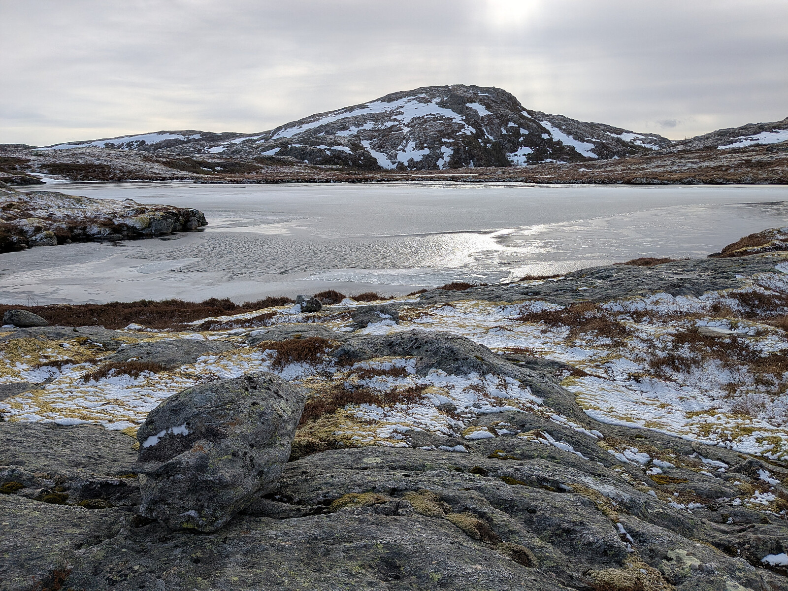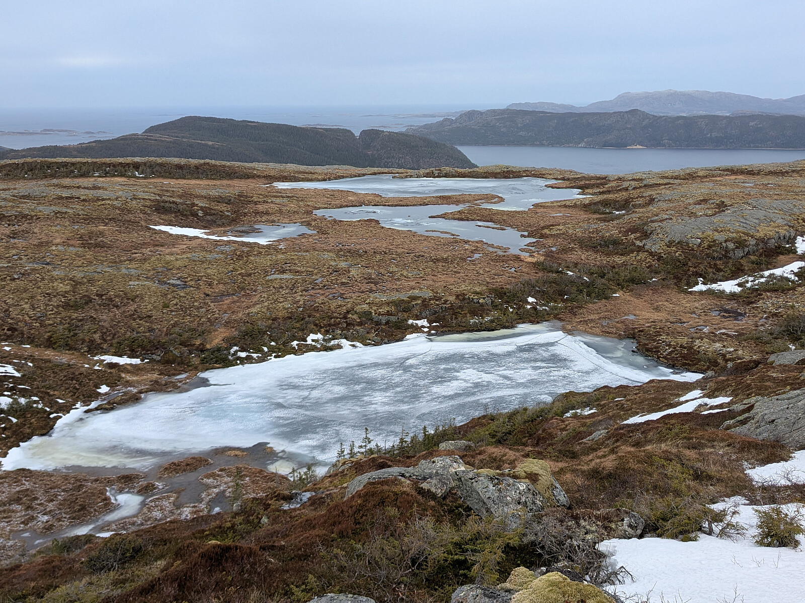 Denne gangen kjørte jeg også til Rød og videre forbi Vangsåsen. Passerte Rødsvatnet og fortsatte til nordenden av Strandavatnet for parkering. Målet var SKAVDALSFJELLET 362 MOH. Starta turen etter en hyttevei og videre etter en traktorvei opp mot skogen. Herfra gikk det en tydelig sti med litt utydelig merking. Ovenfor tregrensa var det vardet opp til to vakre navnløse vann (294 - 290 moh) Jeg passerte vannene og gikk opp til den markerte toppen. Litt hard snø mot toppen. Varde og navneskilt på toppen. Det snødekte Heilhornet er godt synlig fra de fleste toppene i Nærøysund. Retur samme rute men på vestsida av vannene. 4 km. T/R.