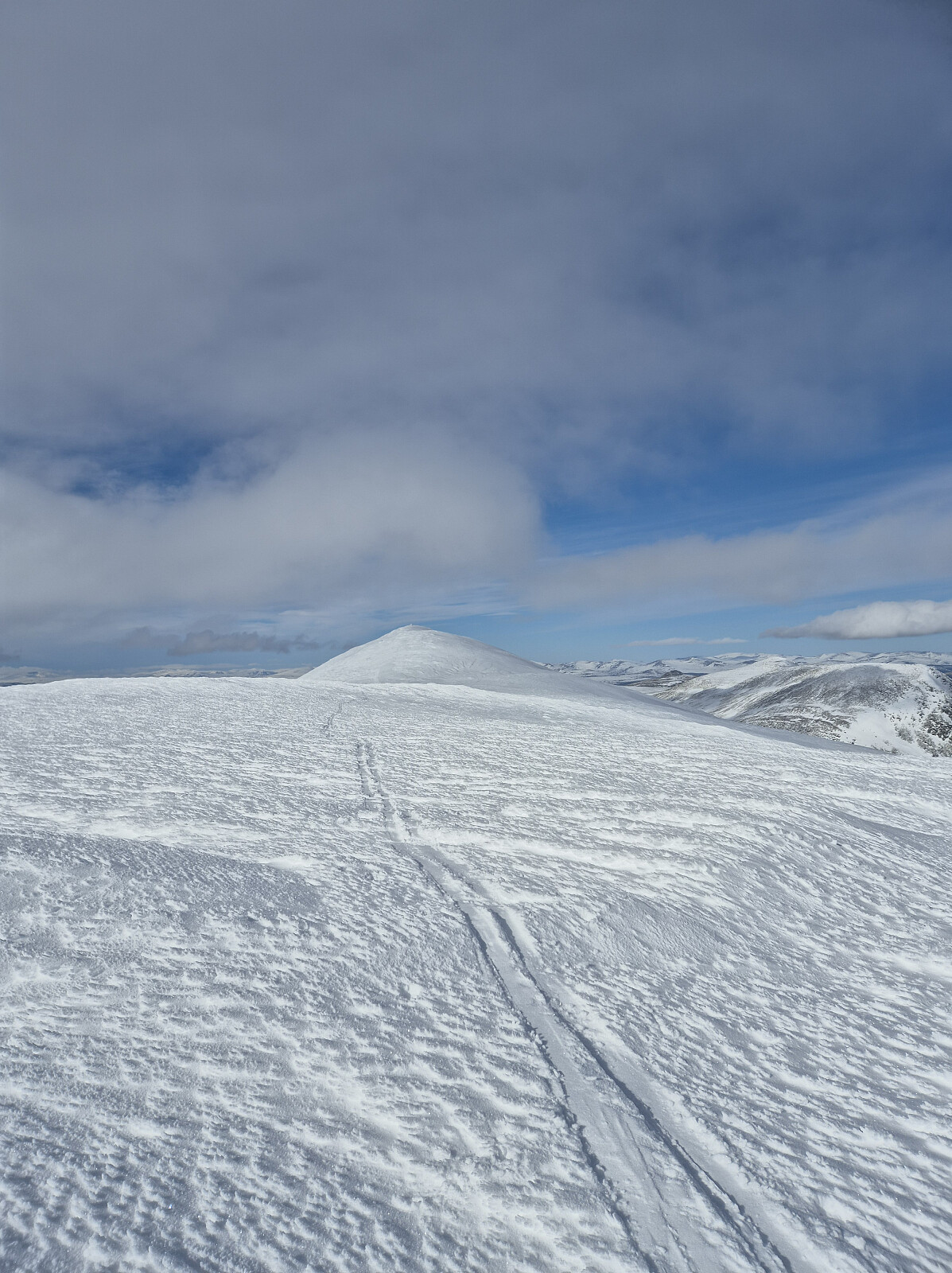 Mens vi gikk bortover ryggen begynte det å blåse opp kraftig, og vindkastene ble etterhvert så sterke at det var vanskelig å stå oppreist. Vi gikk fort tilbake til fortoppen før vi gjemte oss bak en stein og tok av feller og forberedte oss til nedkjøringen. Sikten hadde blitt litt dårligere, og sammen med vinden og det skarete føret, gjorde det nedkjøringen fra toppen litt mer krevende enn vanlig. Da vi endelig kom ned i bollen igjen kunne vi gli over skaren helt ned til skoggrensen. I skogen nedover til bilen var det deilig slusj, og her fikk vi dagens absolutt beste skikjøring.