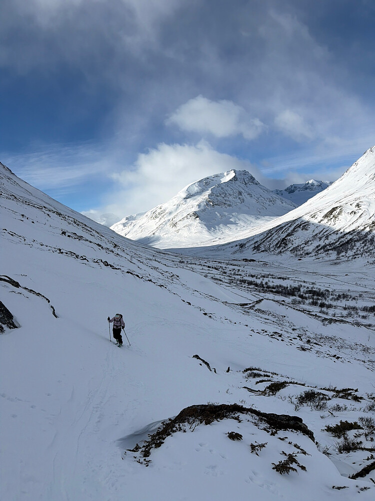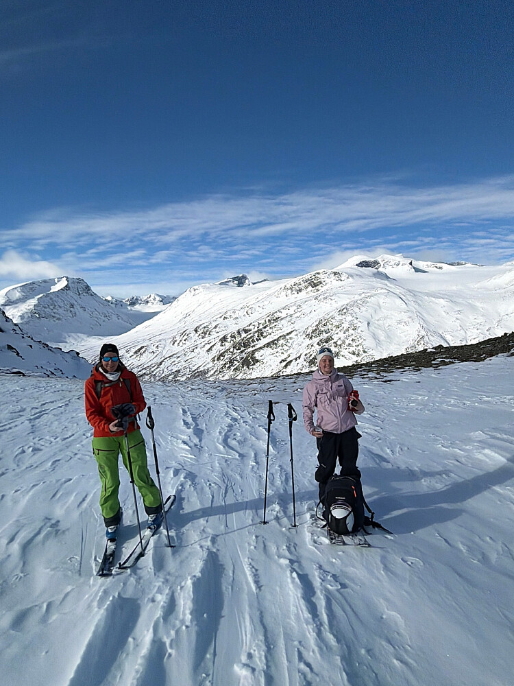 Start fra stien mellom Spiterstulen og Glitterheim. Lite snø, så litt baskete å komme seg inn på Skautflye. Heldigvis mer snø innover der, og ikke minst i renna opp mot toppen. Fantastisk nedkjøring helt ned til Skautflye igjen. På med feller da snøen var trå. Siste biten ned til vegen handla mest om å finne nok snø til å kjøre på. Ble noen nye riper under skia...