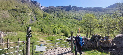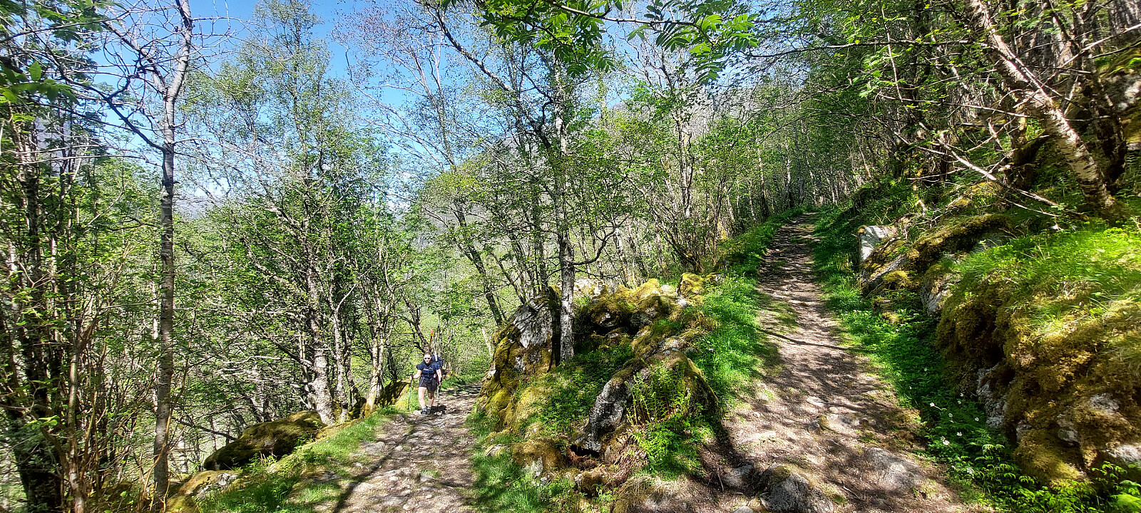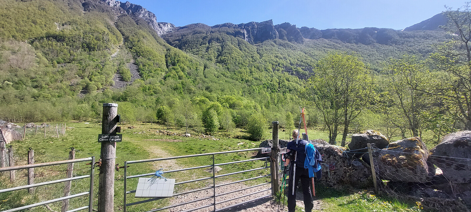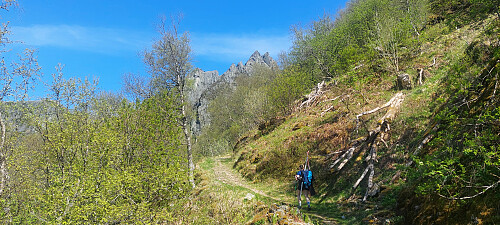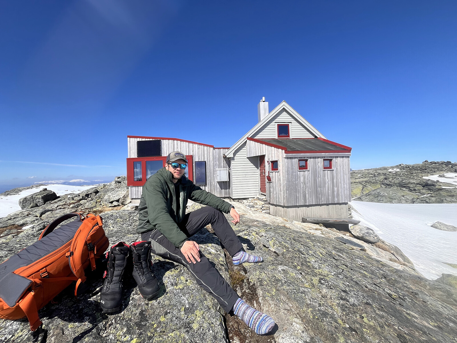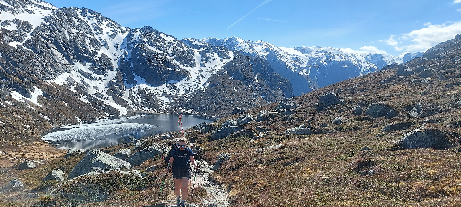 Sola steikte, og Tonje som hadde vore lur og pakka med shorts, bytte til denne straks vi starta på svingane opp mot Gardshammarstølen. Eg derimot måtte svette meg gjennom dagen i skibuksa mi. Vi brukte 2 timar på dei 700 høgdemeterane opp til Gardshammarstølen, noke vi var fornøgde med tatt dei tunge sekkane med ski og breutstyr i betraktning.