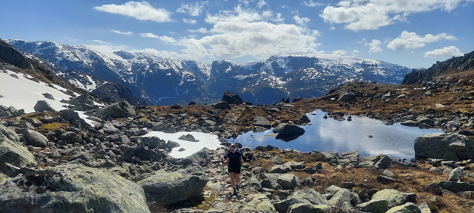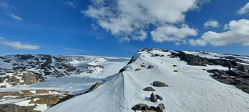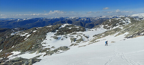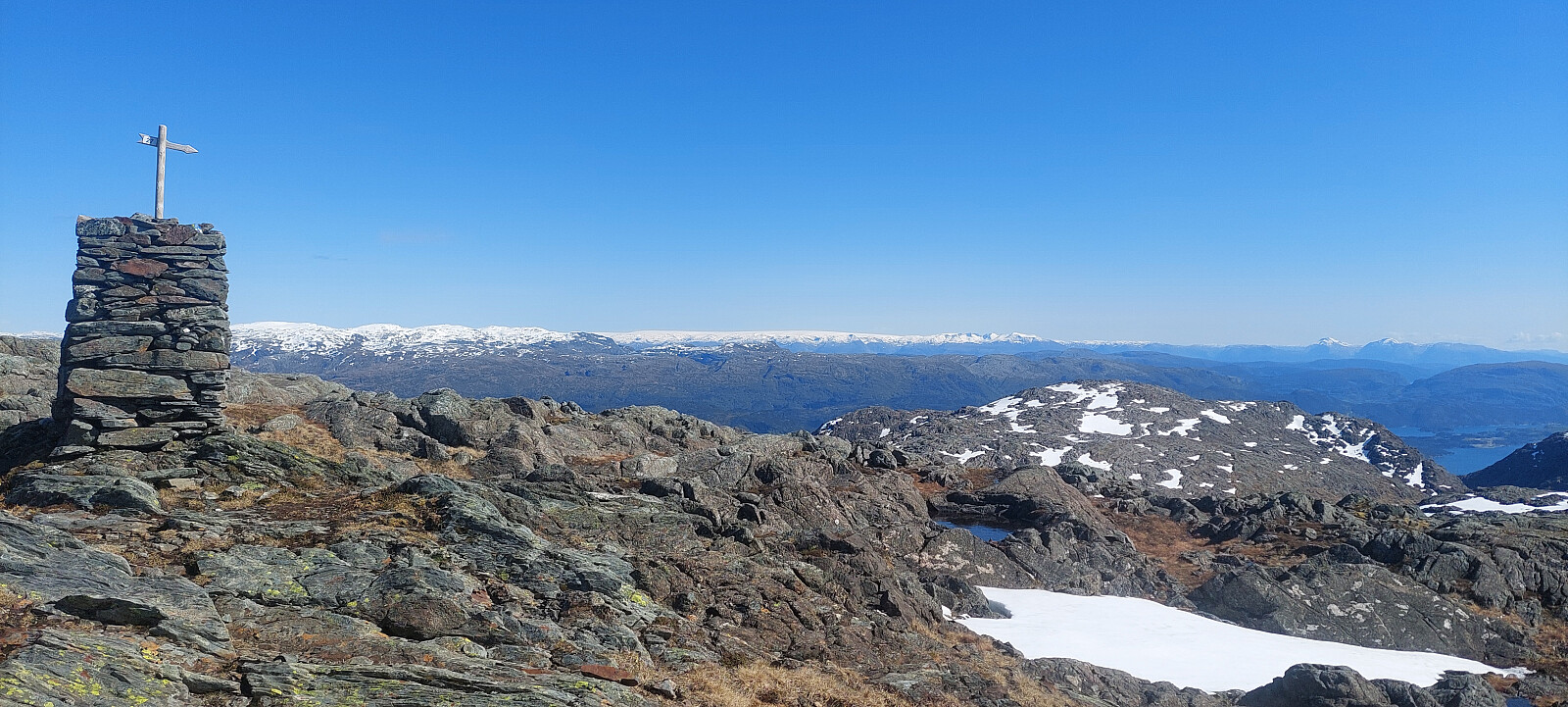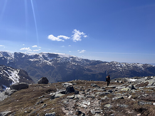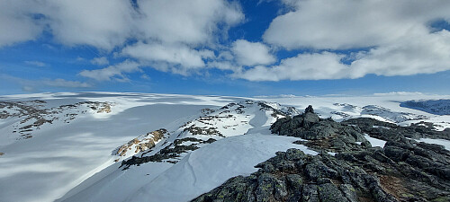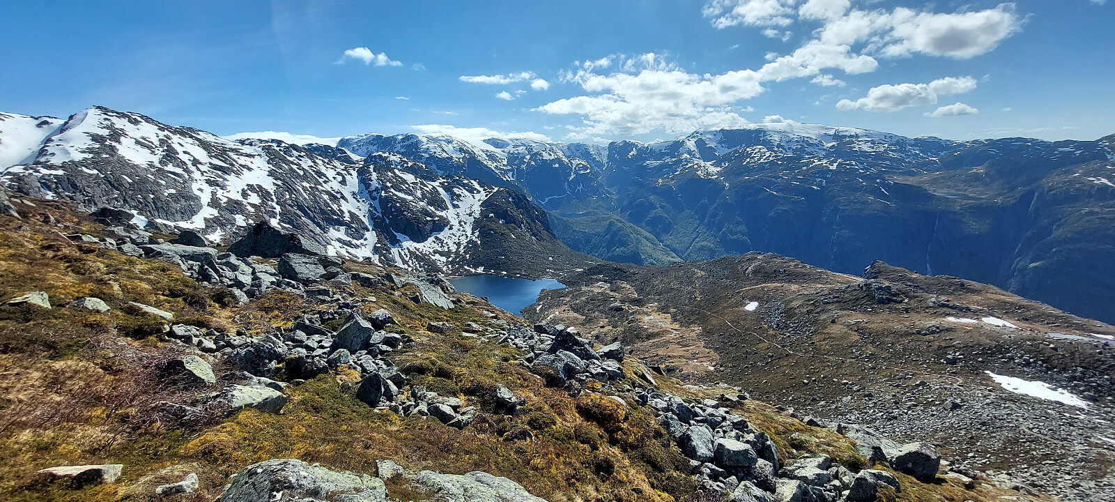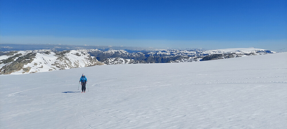 Frå her såg det ut som at vi kunne gå vidare over til Hardangervidda med Hårteigen midt på og Hardangerjøkulen i nord, men vi visste sjølvsagt at mellom oss og dei låg Sørfjorden med stupbratte fjellsider.