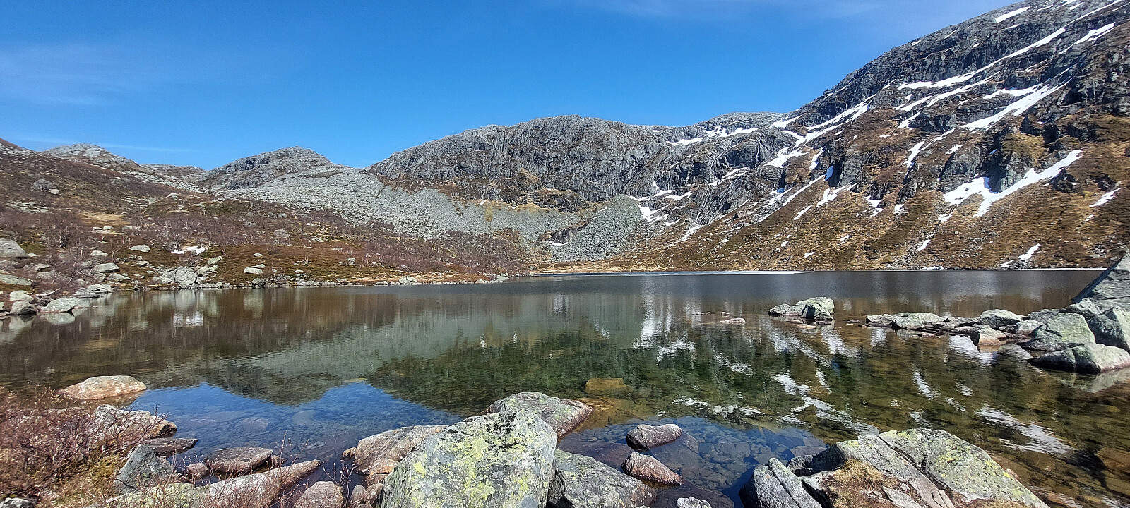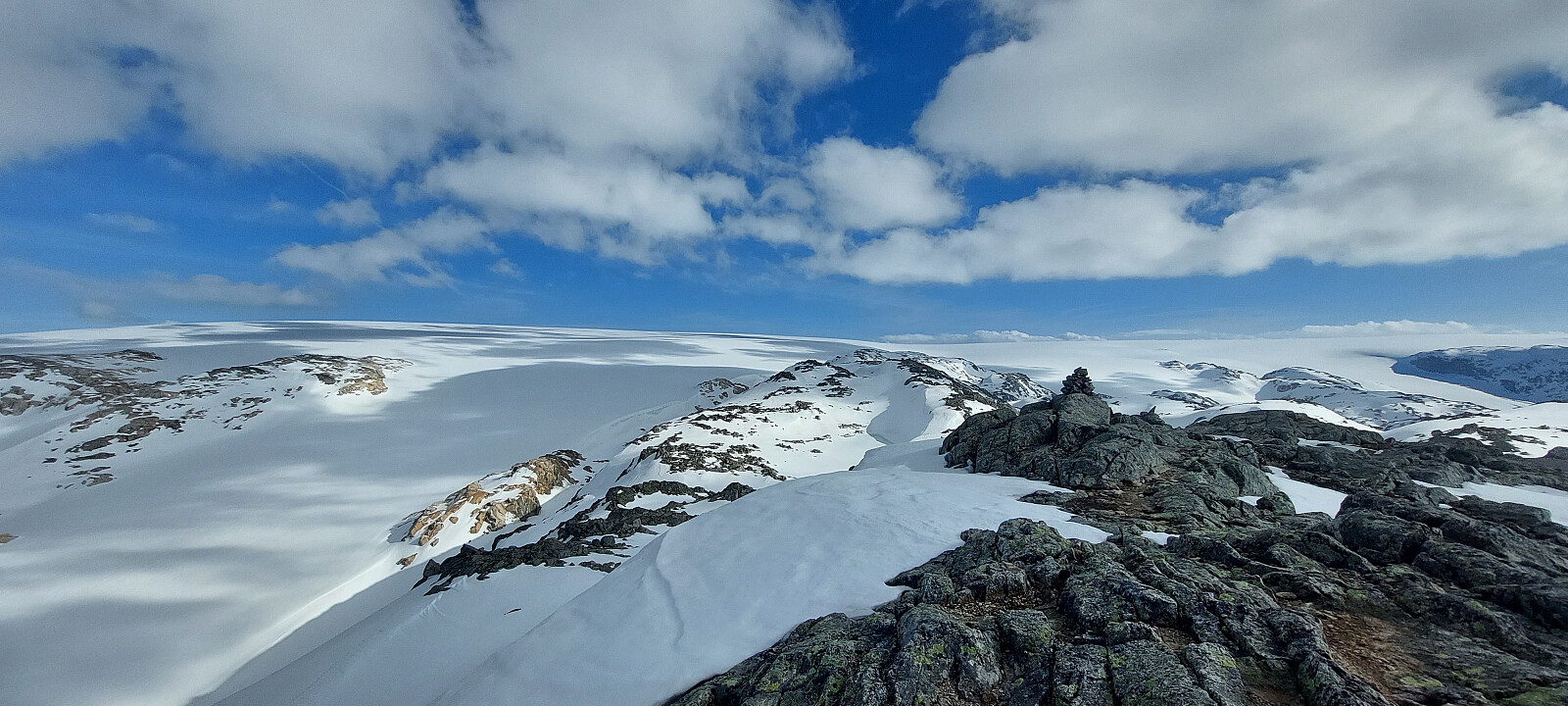 Den første helga i mai var det meldt fint vêr, men frisk bris med liten kuling i kasta frå nord. Vi tok heller turen til Gullfjellet, og prisa oss lykkelig for at vi ikkje var på Folgefonna når vi kika bort i bitande sur nordavind.