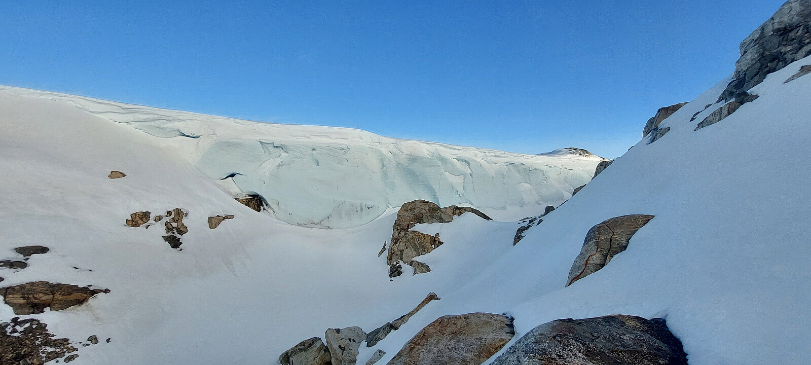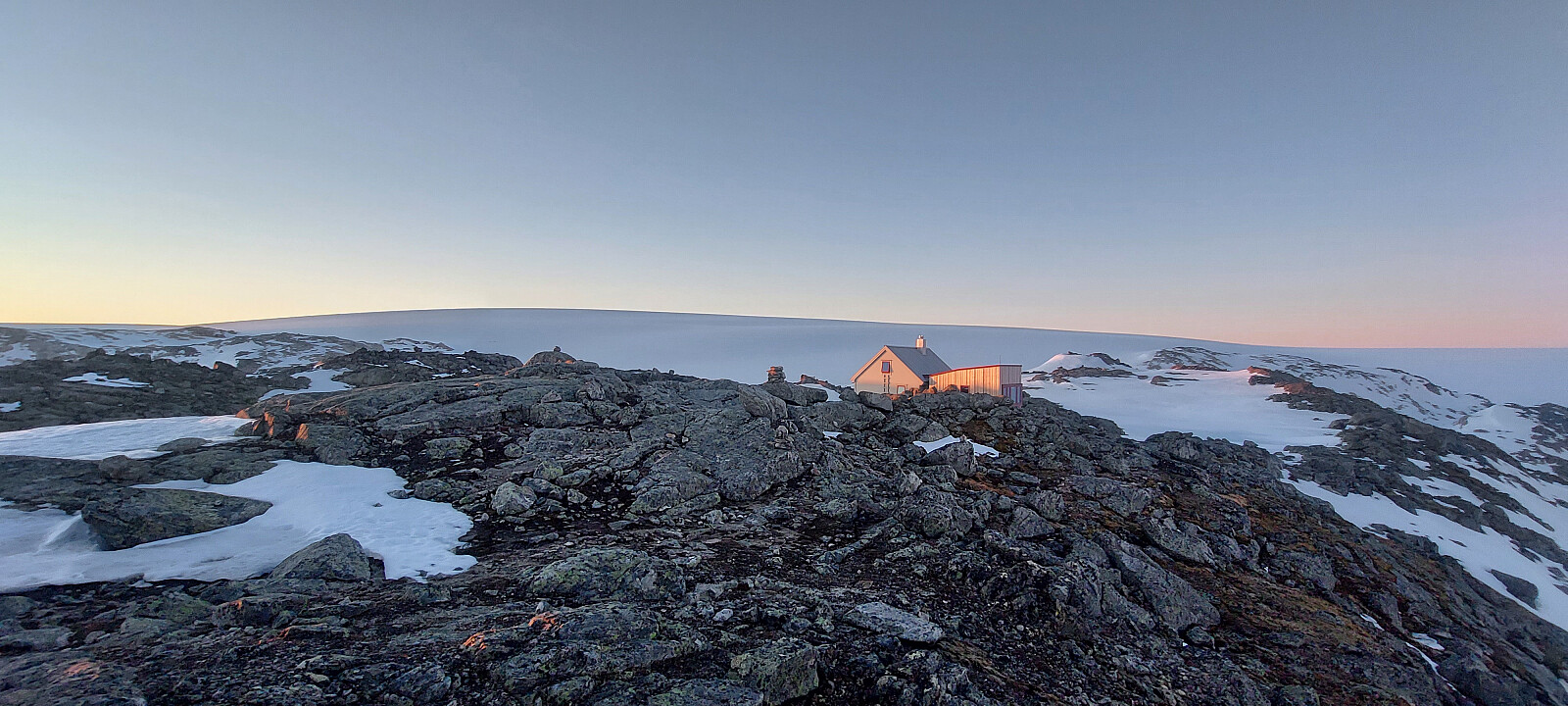 I løpet av kvelden tok eg ein avstikker bort for å kike på breen rett nord for hytta. Breen endar her i eit imponerande stup på nokre titals meter. Ikkje noko ein ønsker å gå seg på ved dårlig sikt!