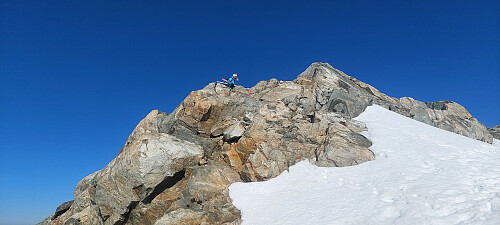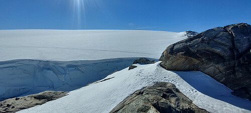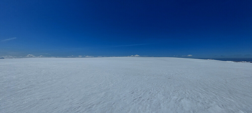 Ein miste fort følelsen av kva som er slakt oppover eller nedover og kva som er flatt oppe i dette terrenget, då alt rundt deg er kvitt. I det GPS'en viste at vi nærma oss toppunktet steig skydottane i aust opp frå brehorisonten som la seg, og Hardangervidda tredde fram. Heilt rått!