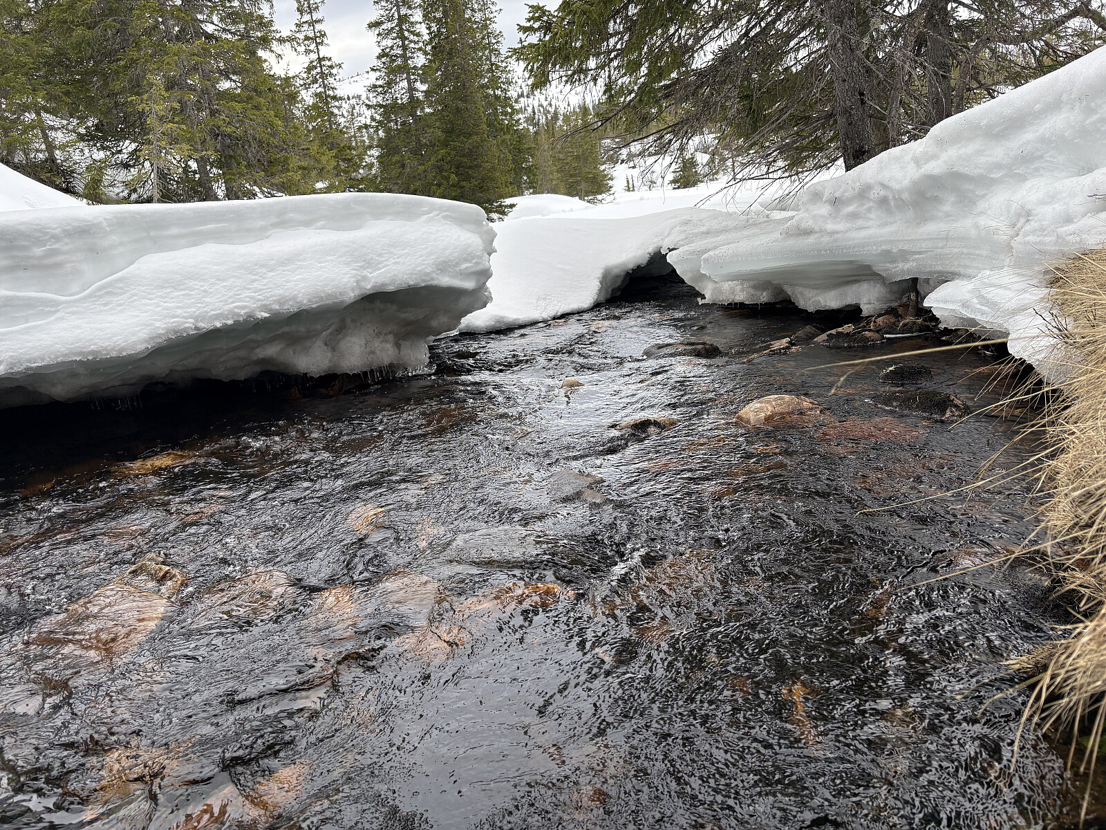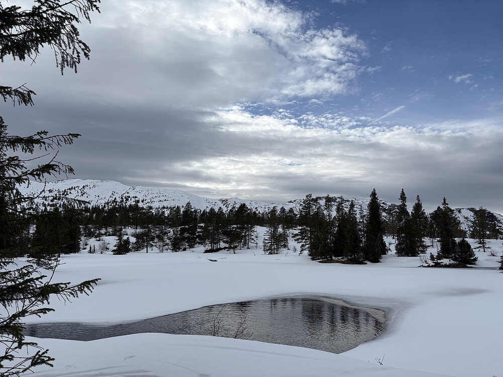 Bløtt i skogen og vanskelig med elvekyssinger. Tilbake i 2020 var dette en parademarsj med masse snø. Nå var det mye men med åpne elvesig. Varmt var det her og nøt bare turen. Fellene var nå helt krise men det gikk på et vis. Skulle over en bekk og måtte kaste skiene, dessverre amatørmessig falt en av tuppene ut i vannet. Denne fellen var det ikke noe håp for lengre. Nå ble det armstyrke på en ski.