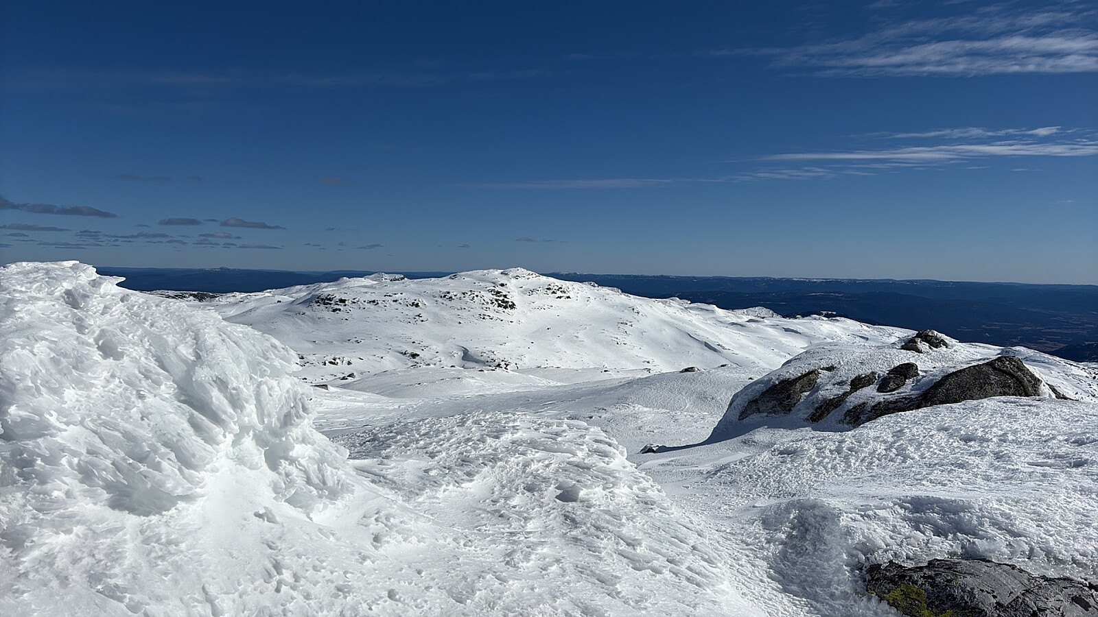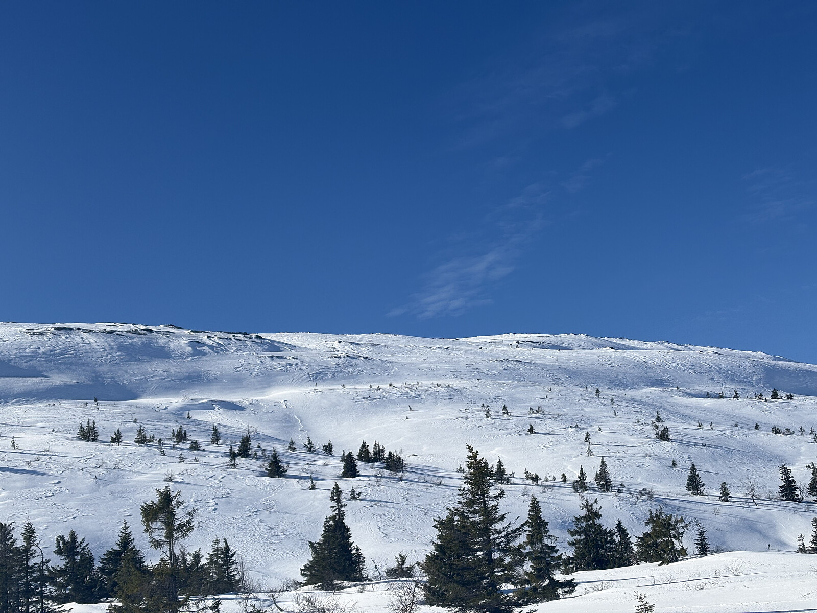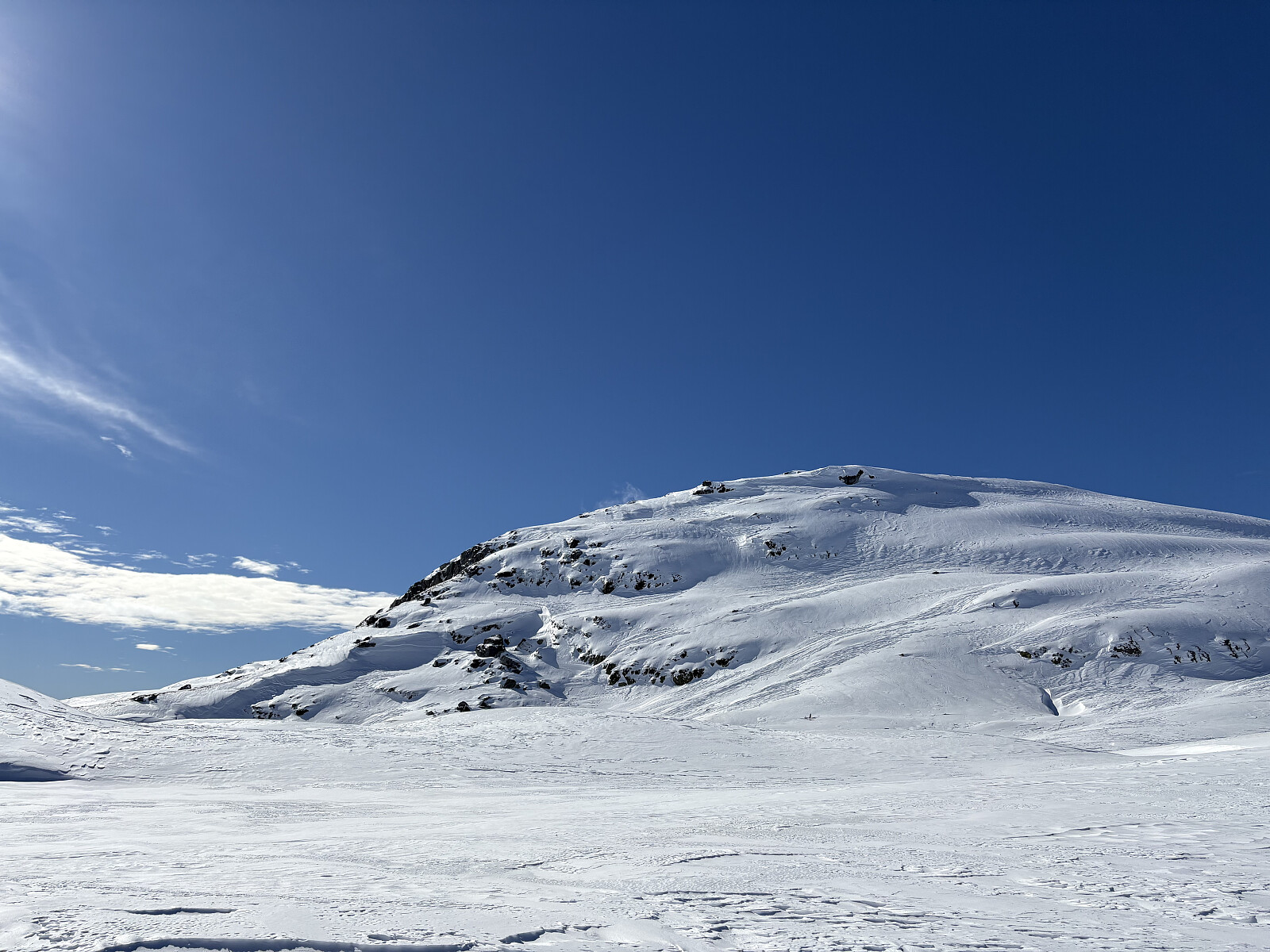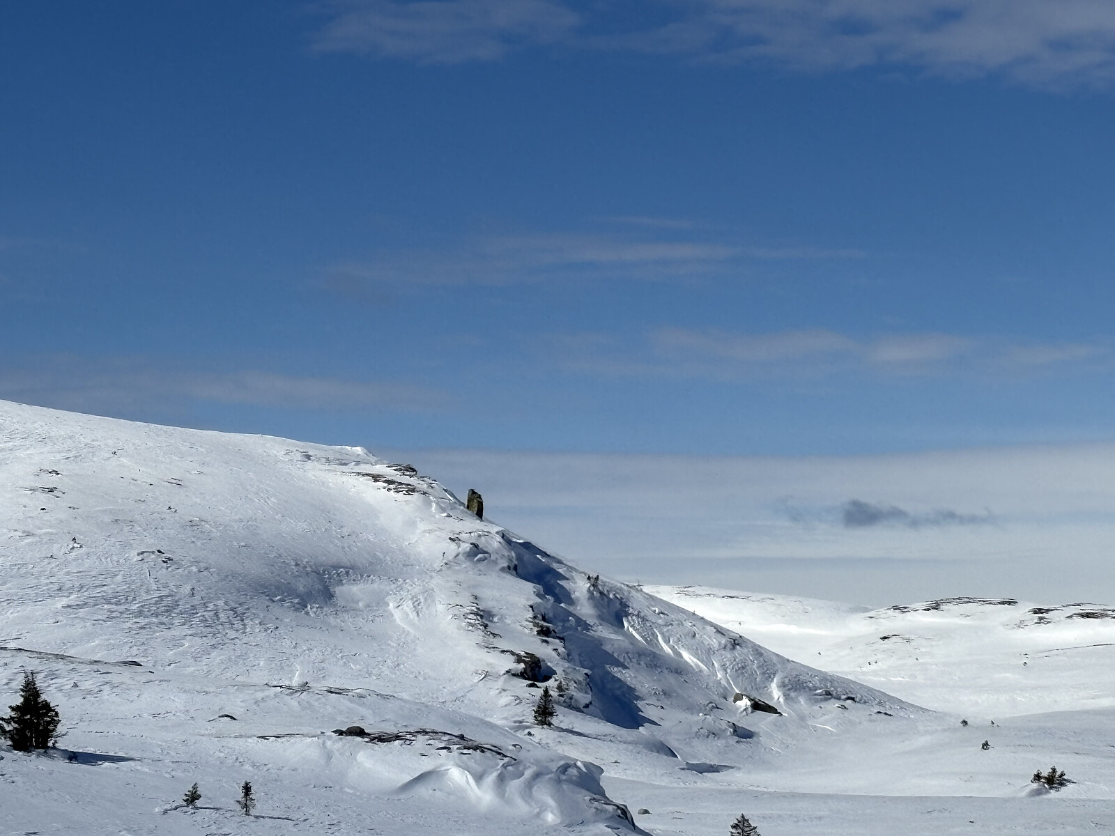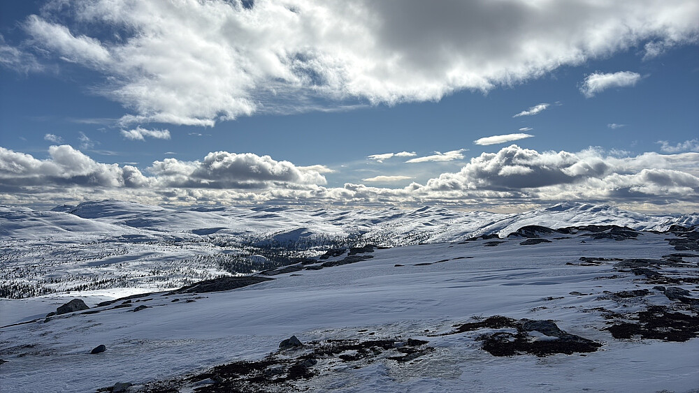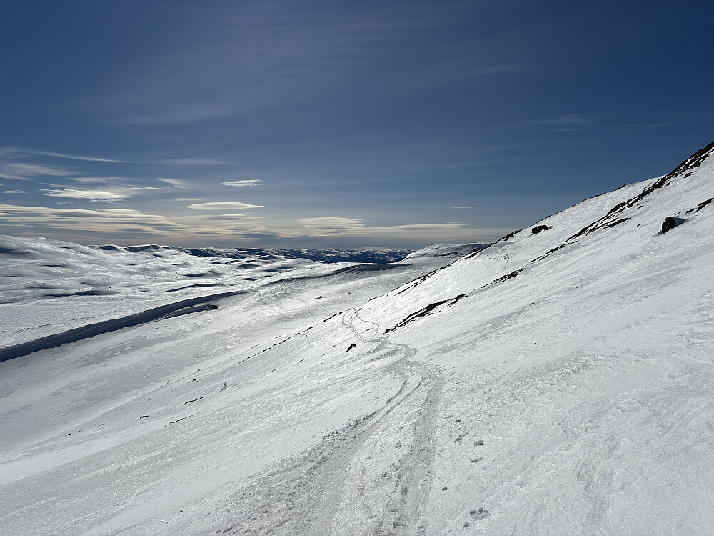 Videre oppe på platået var det krevende å finne rett vei pga særdeles store skavelformasjoner. Solskare og vindpåvirket snø om hverandre. Gnagsårene var tilbake og på 3 punkter på hver fot. Skjønte at det måtte være de totalt utslitte sokkene mine i en blanding av ull og noe plastdrit. Ulla var slittvekk så fiberen sto som sager mot huden. Bet tenna sammen og gikk det av meg periode for periode gjennom dagen.