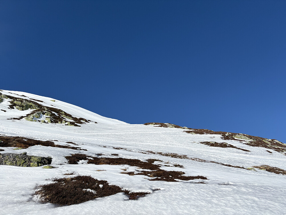 Bratt oppover og nesten ingen snø. Derimot såpass bløtt at det var lett å baute oppover til toppryggen. Ca 35 grader på det bratteste.