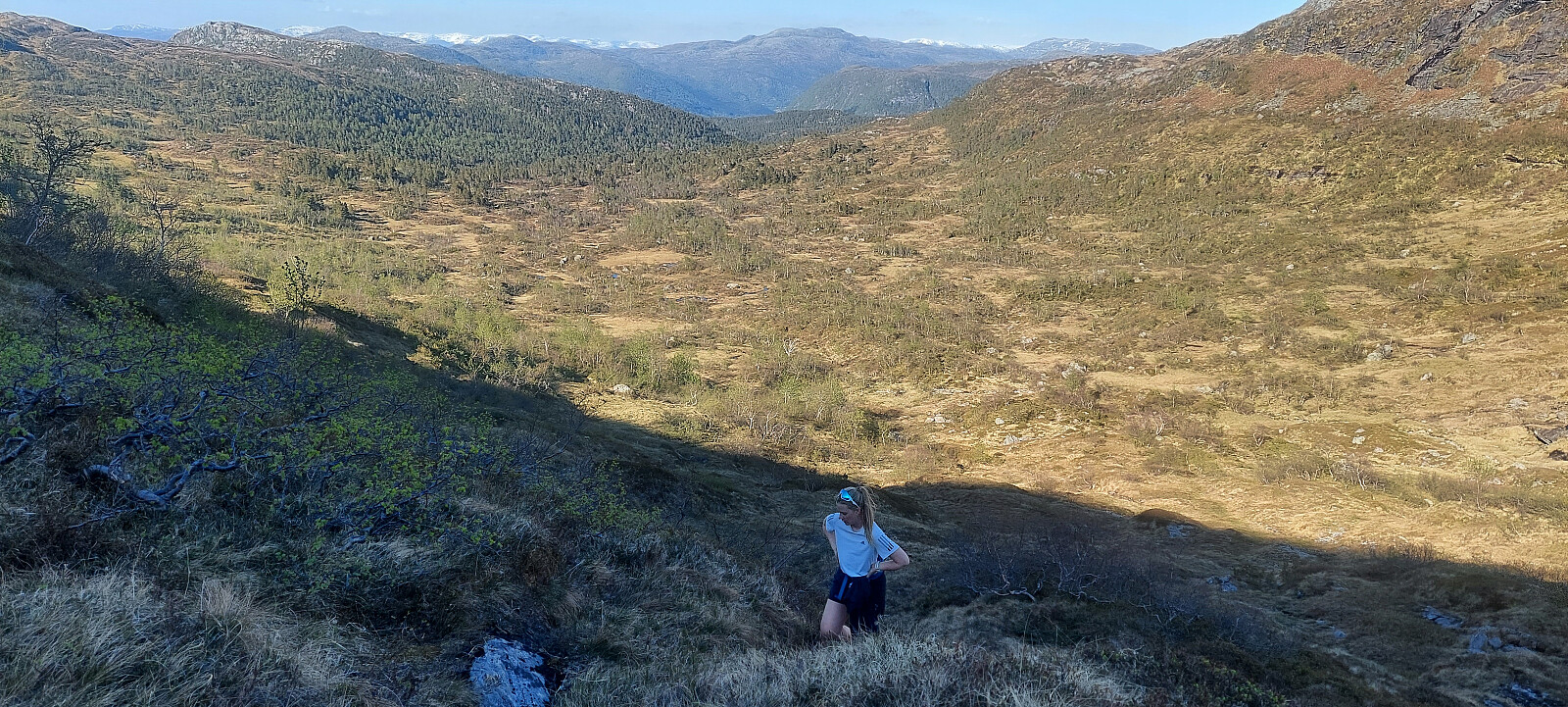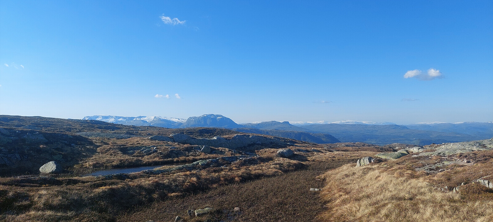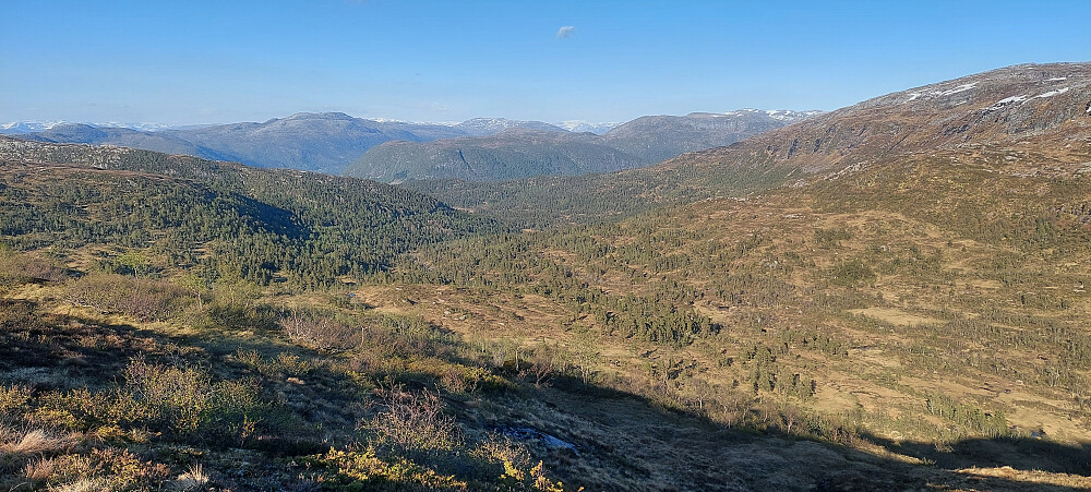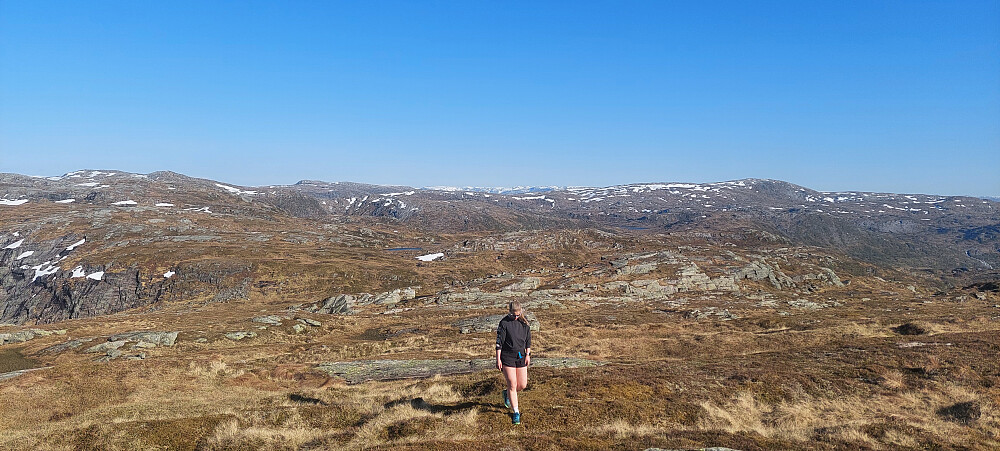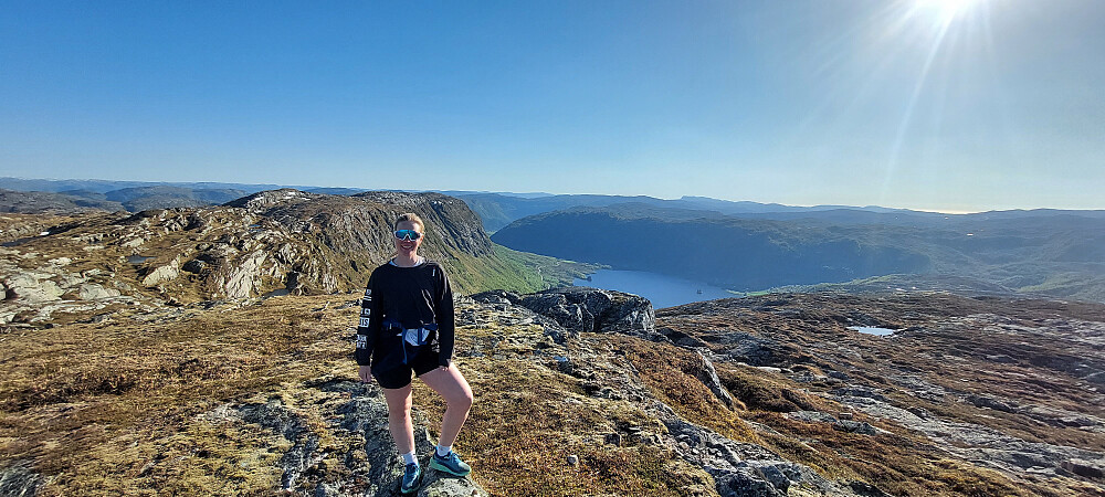 Etter ca. 150 høgdemeter kom vi oppå eit kuppert platå som førte oss vidare mot toppen. Her åpna utsikta seg til alle kantar.