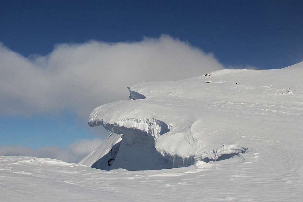 Da hadde jeg spor over Gråsteinsmyrane også. Tynt snødekke gjorde at myr med vanndammer slo opp i sporet. Selv om jeg prøvde å unngå det verste, blei fellene våte, og bygde fine klabber av tørrsnøen, som dominerte overflata. Etter flere stopp, og ved å gni inn gilder på fellene, klarte jeg å bli kvitt det verste, da snøsålen etterhvert isolerte mot jordvarm og fuktighet. Spennende og variert terreng brakte meg opp til foten av Røyrhusnibba, videre bratt opp og ut på ryggen, som jeg fulgte til topps. Det kom noen vindkuler innimellom, men i flere partier varma ettermiddagsola godt. Det blei ei artig og variert nedkjøring. Det går knapt an å ønske seg bedre forhold på denne turen. Kremtur!