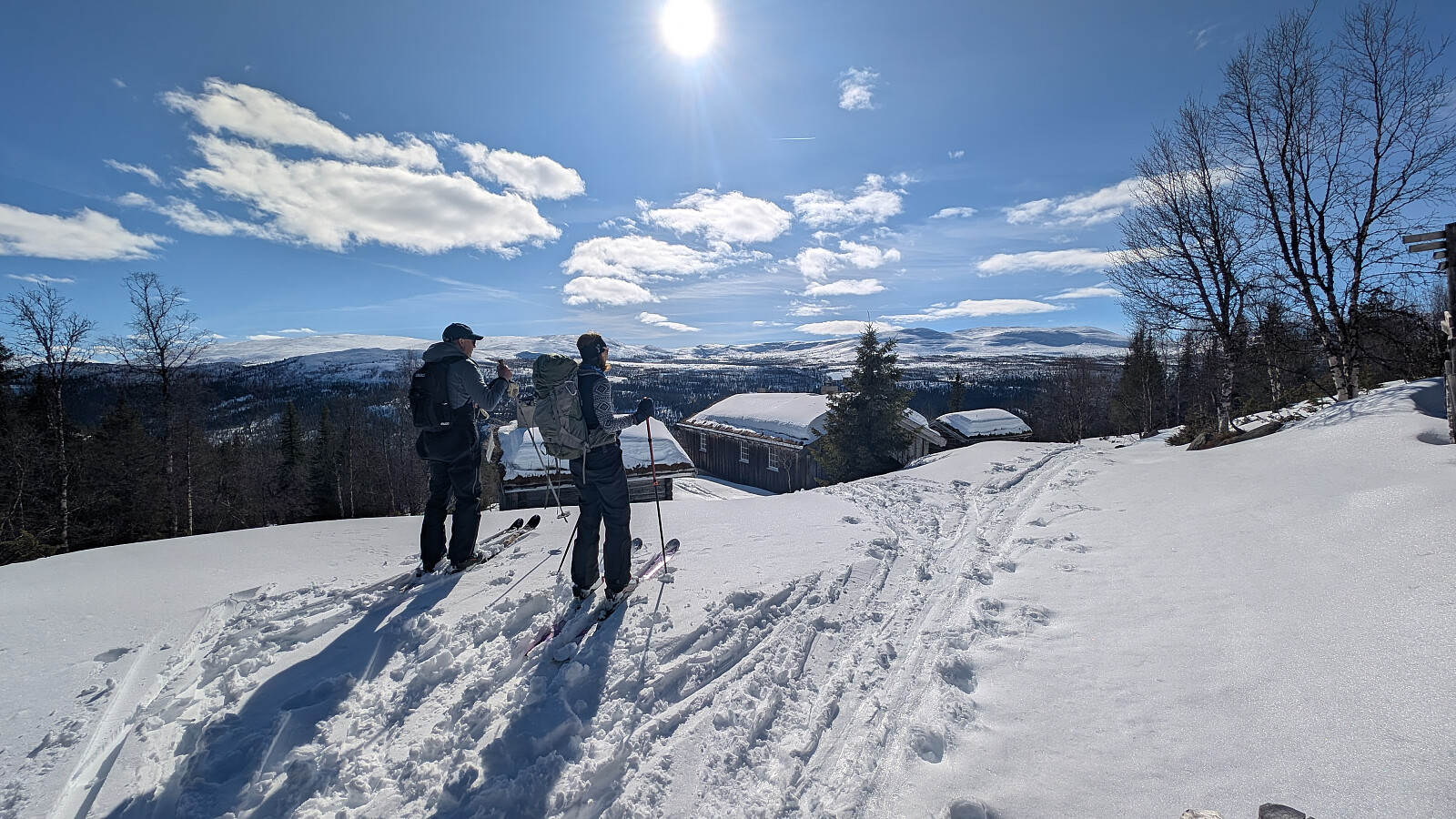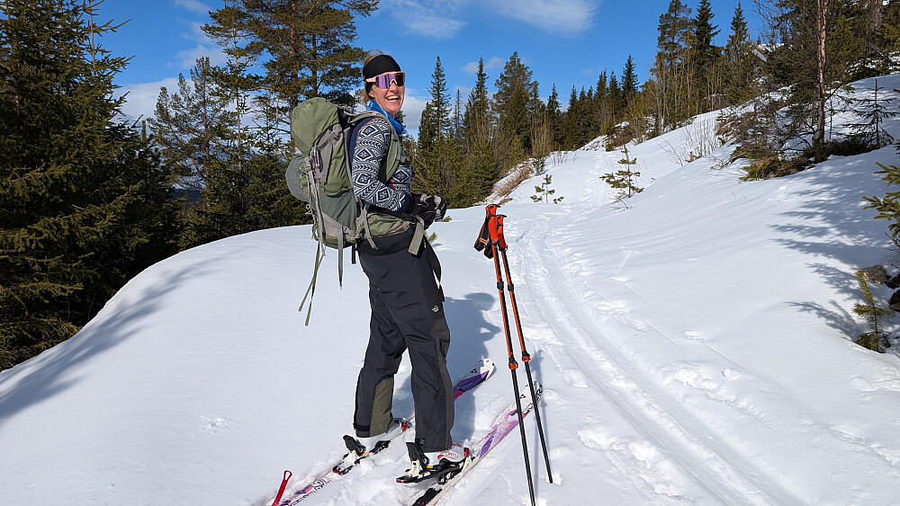 Vel nede mellom toppene ble det matpause i sola. Varmt og herlig. Veldig greit opp til Søre Gråhøe...endelig uten kladder under skiene mine. Gode snøforhold opp mot toppen og vi fikk greie kjøreforhold fra toppen til vi kom ned under selve toppen. Derfra ble det flotte kjøreforhold ned mot skogen og gjennom denne. Kort fotopause ved setra. Derfra fin nedkjøring i trase helt ned til bilen. Takker Eli og Nils Jørgen for en fantastisk dag i Espedalen til to flotte fjell.
