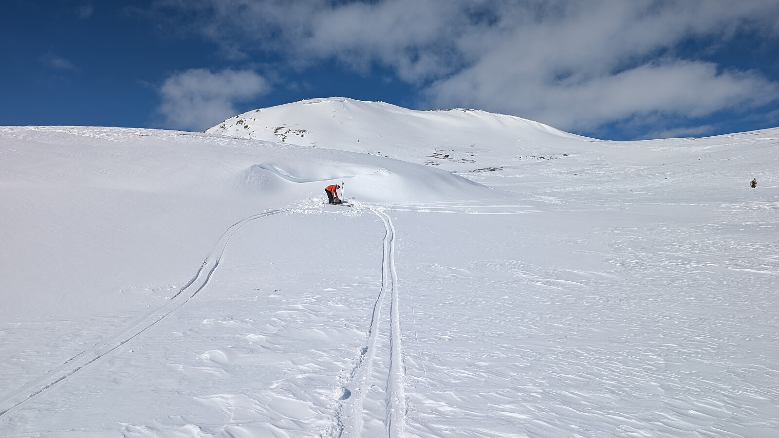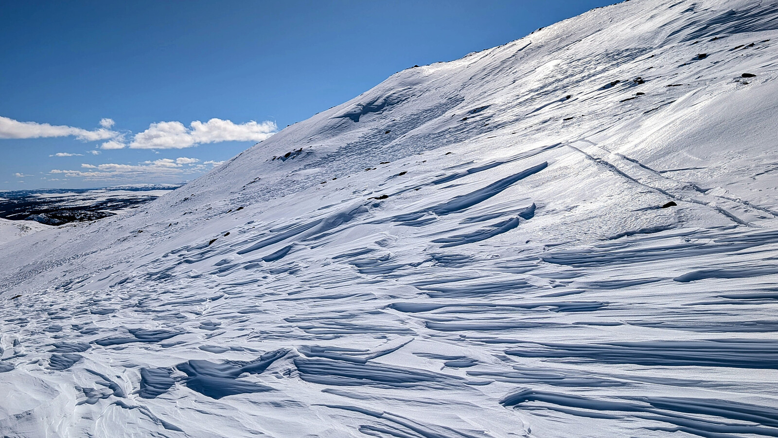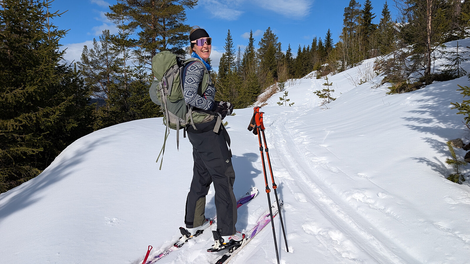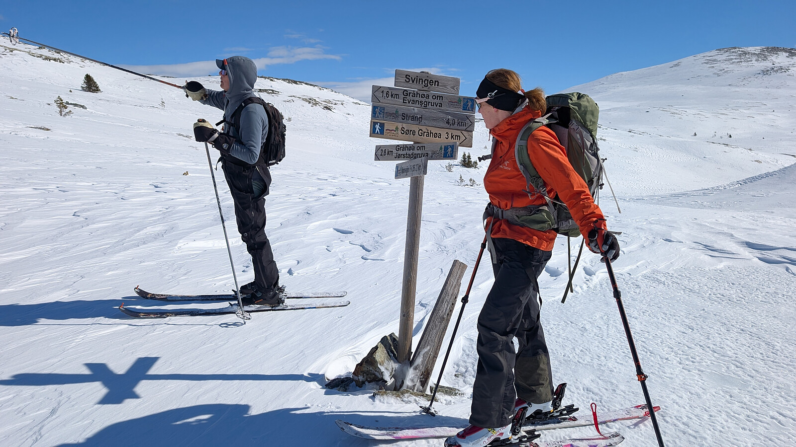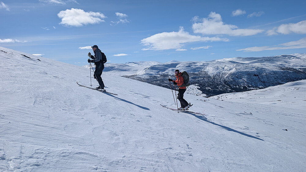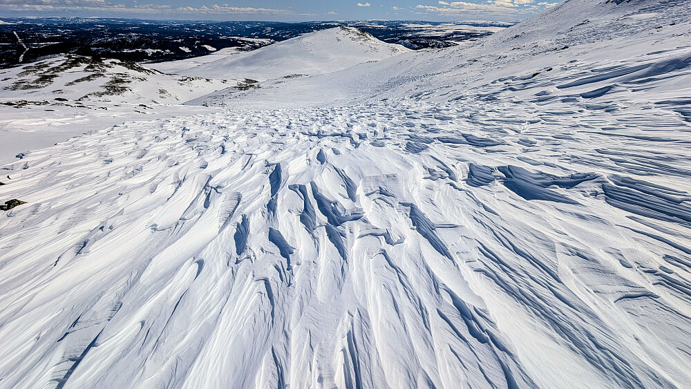 Det ble en nydelig dag i fjellet. Denne gangen startet vi fra Strand Fjellstue. Startet greit, men for meg ble det litt ekstra kjipt pga kladder under fellene. Det slapp de andre og det ble litt ekstra tungt og irriterende. Dette ga seg ikke før vi var nesten opp på Gråhøin. Litt vind på toppen, men absolutt levelig. Resten av turen var det svært lite vind og vi fikk en herlig solskinnsdag i fjellet. Nydelig utsikt fra dette fjellområdet. Så var det av med feller og starte nedkjøringen. Heller ikke denne gangen var det enkle forhold nedover, men stedvis helt greit. Veldig spesiell vindpåvirket snø flere plasser. Kalles vel Sastrugi tror jeg.