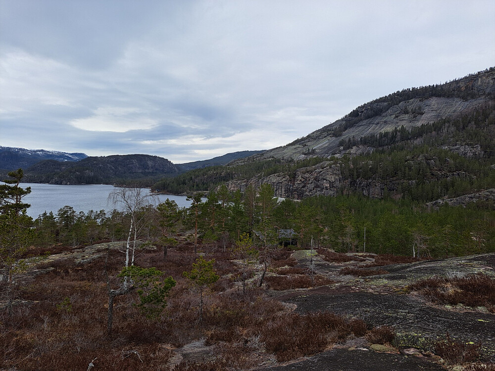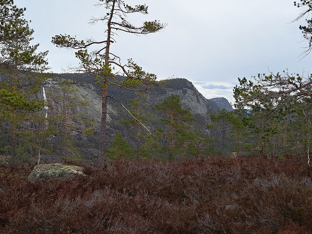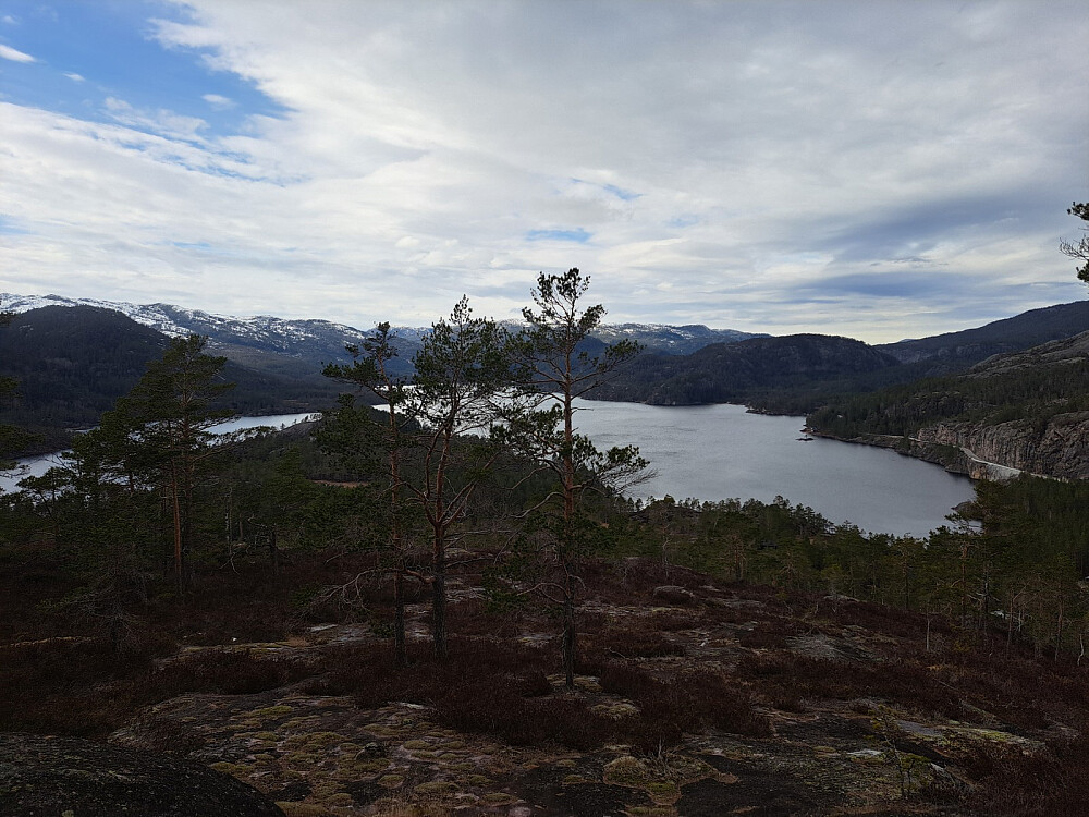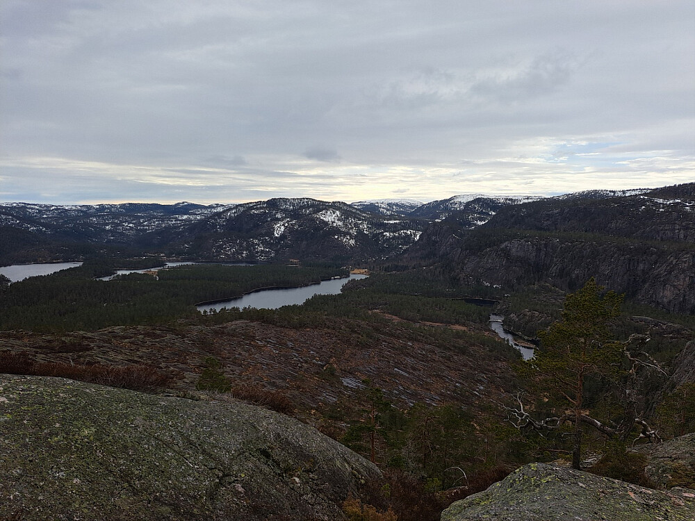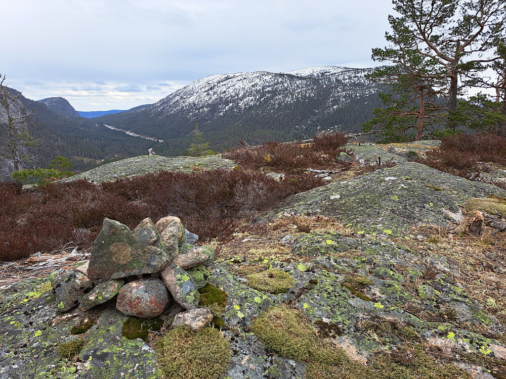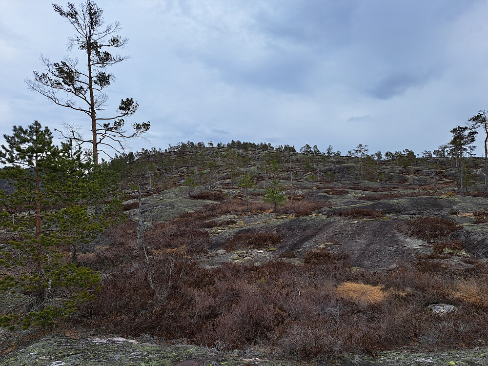 Jeg fulgte LivogKristen sitt spor oppover forbi hyttene og videre oppover på svanene. Utrolig flott og lettgått her. Jeg passet på å holde til venstre der det er en skrent og kom forbi greit. Forstsatte videre på svaene opp til toppen. Selve toppen hadde litt skog, overraskende. Fint utsikt i alle retninger. Litt vind og yr i lufta så ikke lange pausen, men litt mat ble det.
