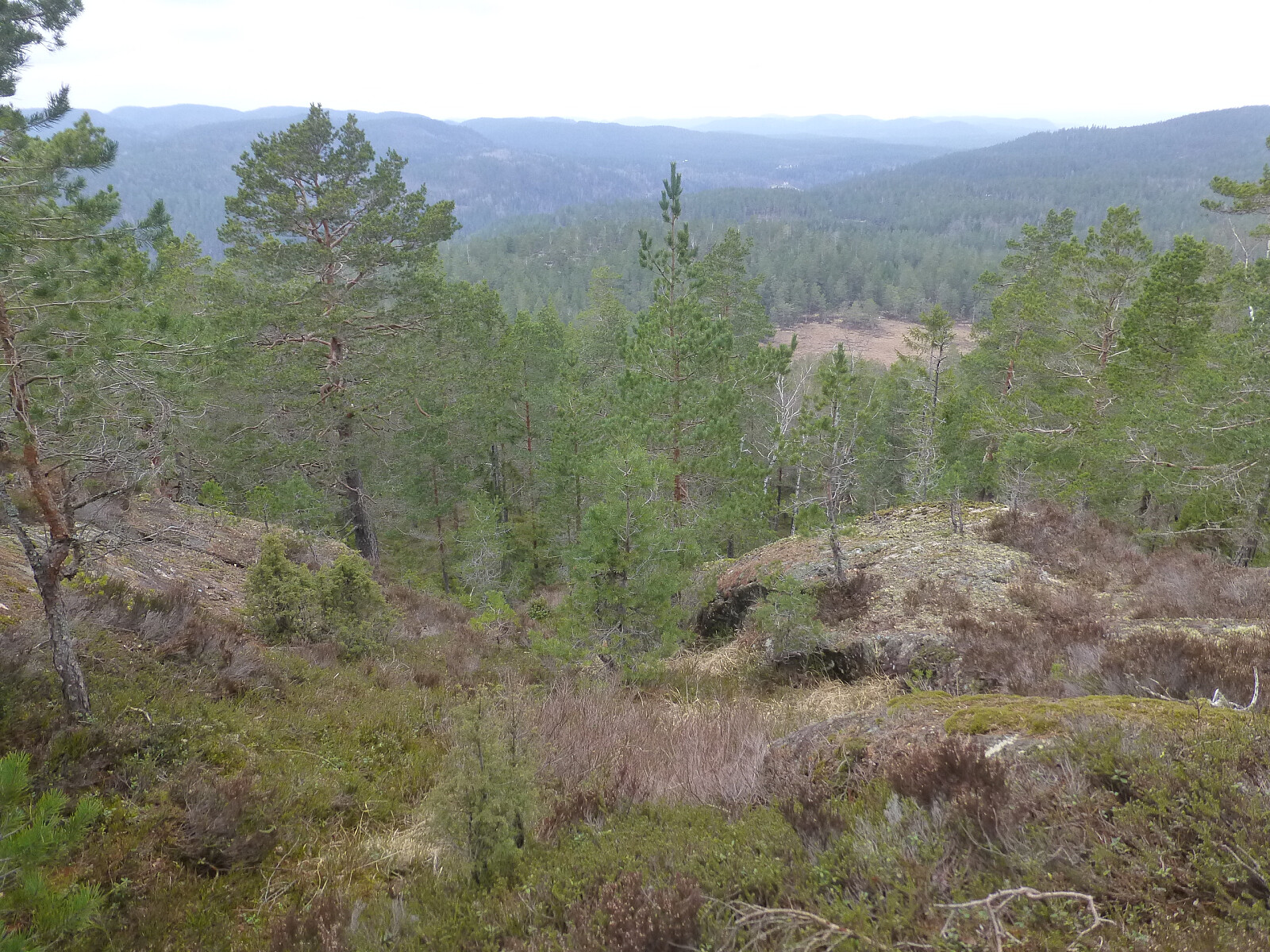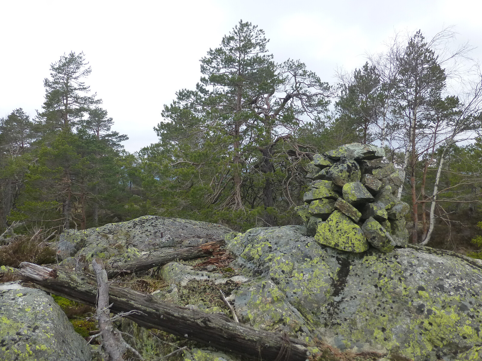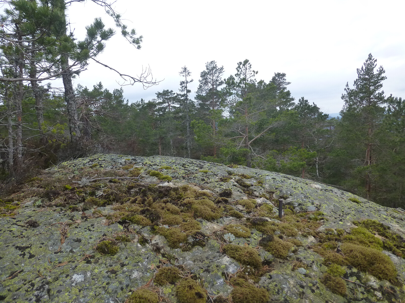 Jeg gikk inn til Bosmangen og videre på en traktorveg som førte meg oppover i lia. Ved en liten vannpytt så gikk jeg over bekken og i retning toppen. Det er gode tråkk oppover i starten. Røsslyng og blåbærlyng i fin furuskog det meste av vegen. Siste delen må jeg opp en skrent, men fant en fin oppgang den JoSo hadde valgt. Så var det å tusle opp til toppen. Kom først opp til en topp med bolt og så videre til toppen med varde.