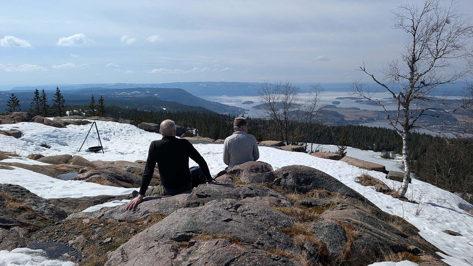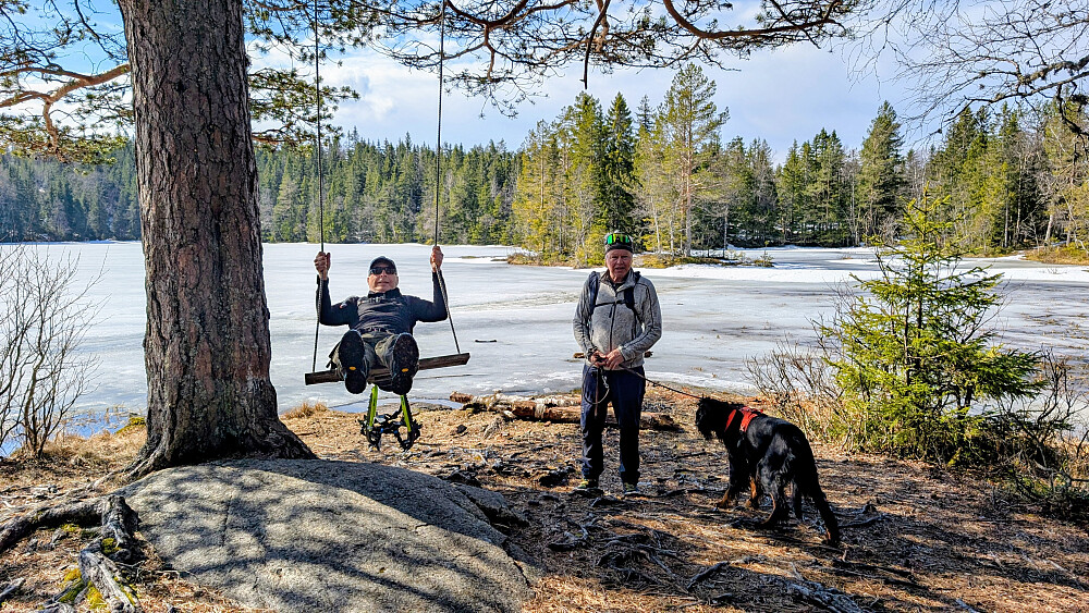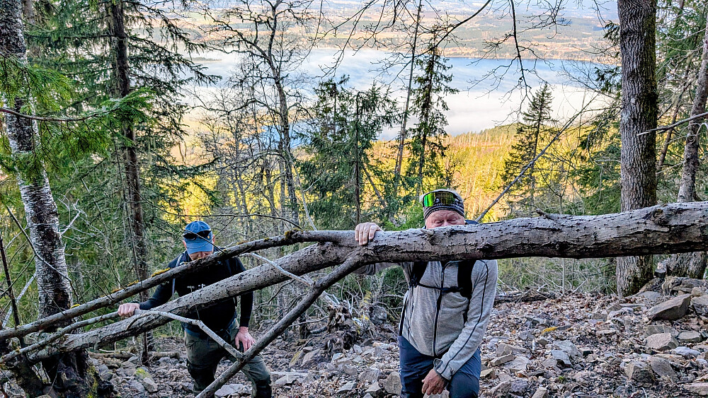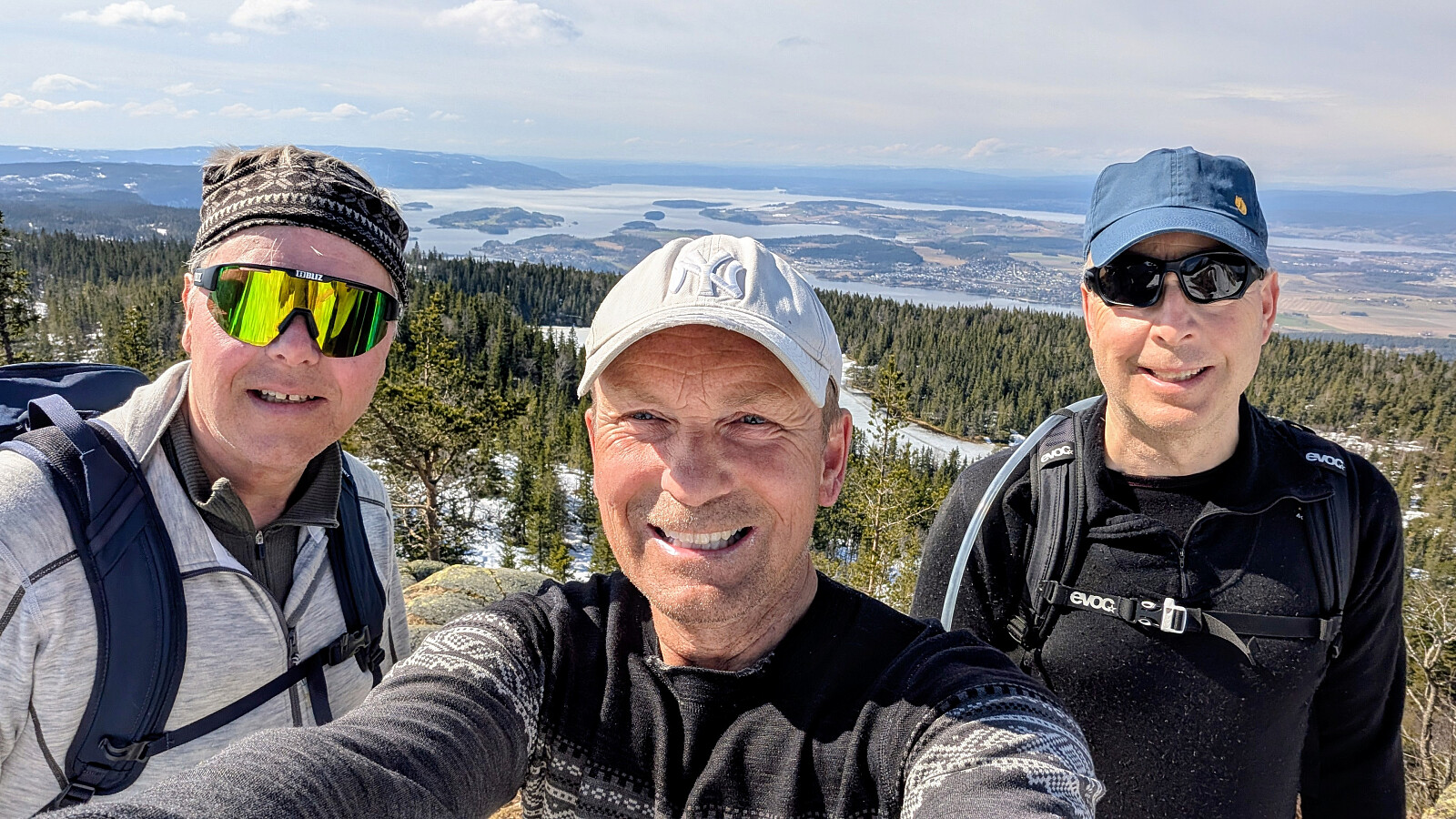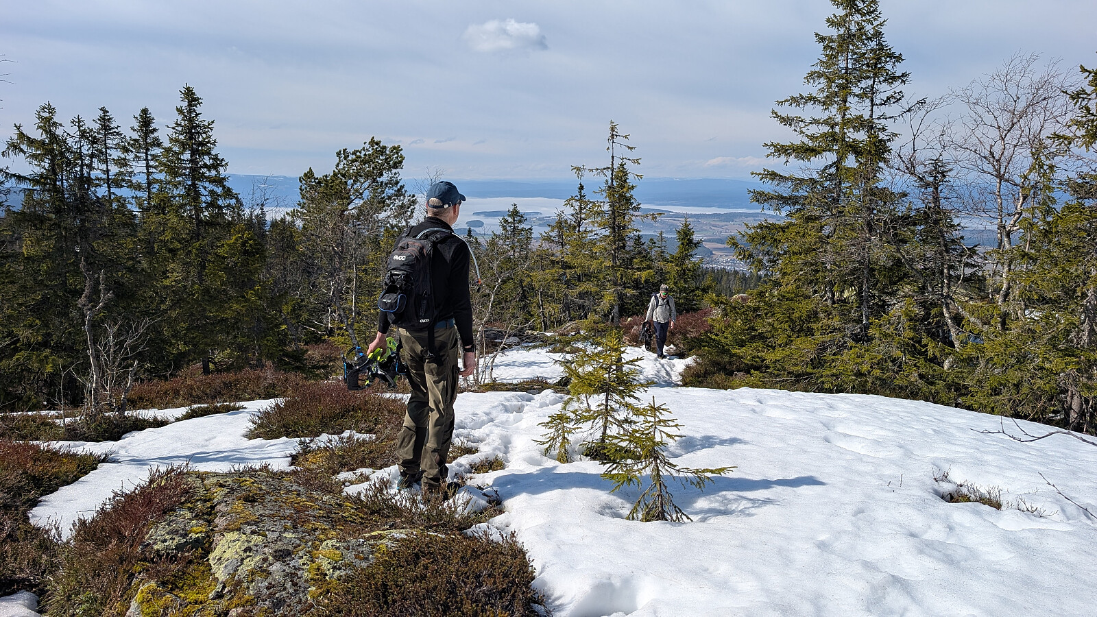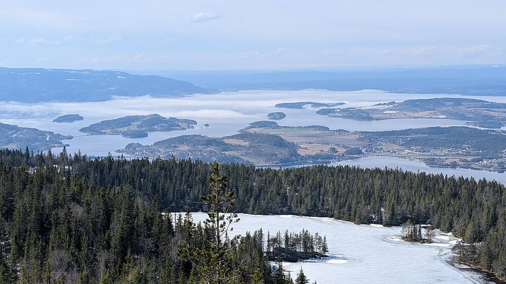 Øverst i skaret var det greit videre, men truger måtte på et godt stykke. Tok på de etter vannet. Noe før toppen var det barmark. Herlig utsikt på toppen og varmt i sola. Gikk greit ned mot vannet igjen og tok truger. Valgte nok en feil sti videre som gjorde turen litt lengre. Måtte bruke truger et godt stykke før vi kom ned mot Skardtjernet. Derfra greit traseen nedover med stedvis flott utsikt over Tyrifjorden.