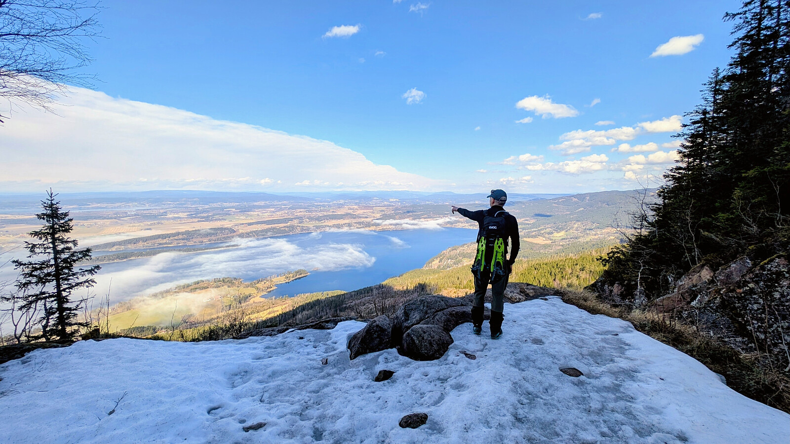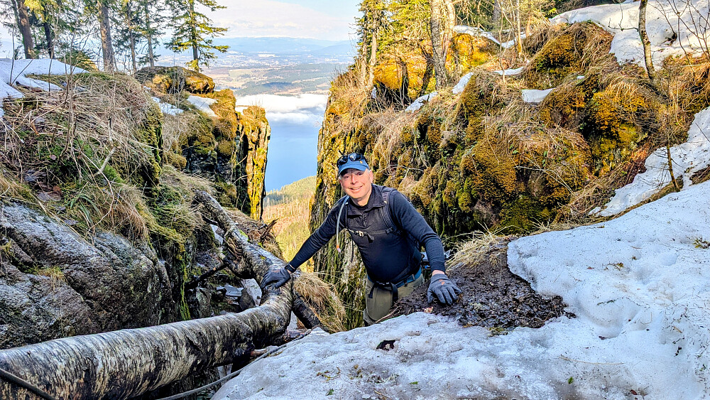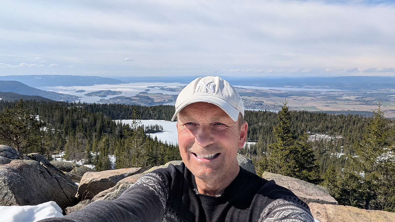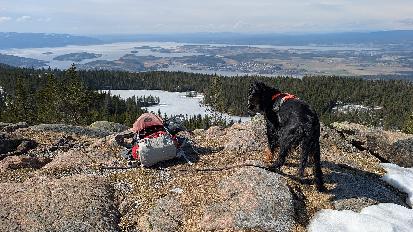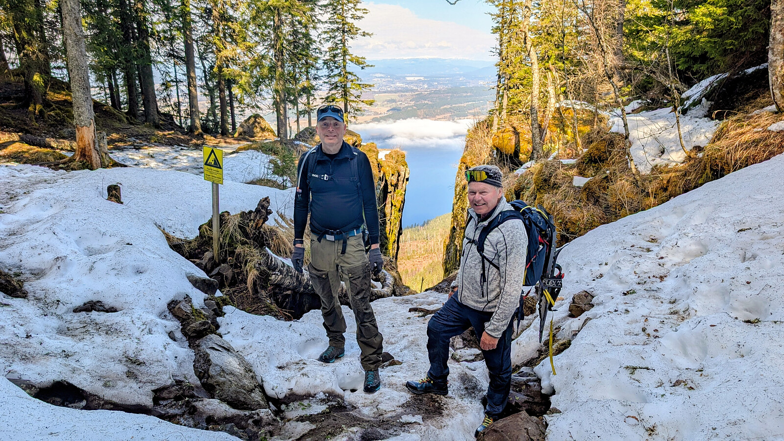 Øverst i skaret var det greit videre, men truger måtte på et godt stykke. Tok på de etter vannet. Noe før toppen var det barmark. Herlig utsikt på toppen og varmt i sola. Gikk greit ned mot vannet igjen og tok truger. Valgte nok en feil sti videre som gjorde turen litt lengre. Måtte bruke truger et godt stykke før vi kom ned mot Skardtjernet. Derfra greit traseen nedover med stedvis flott utsikt over Tyrifjorden.