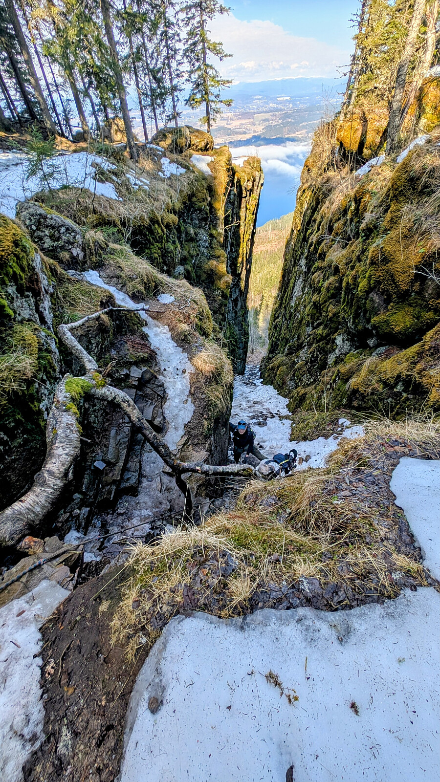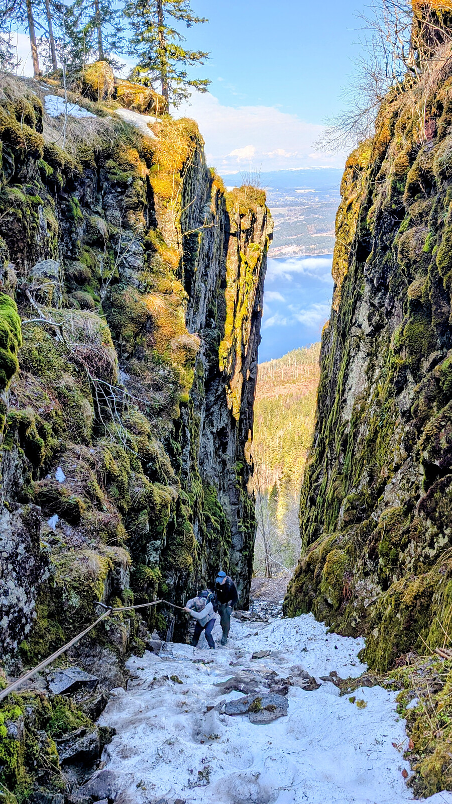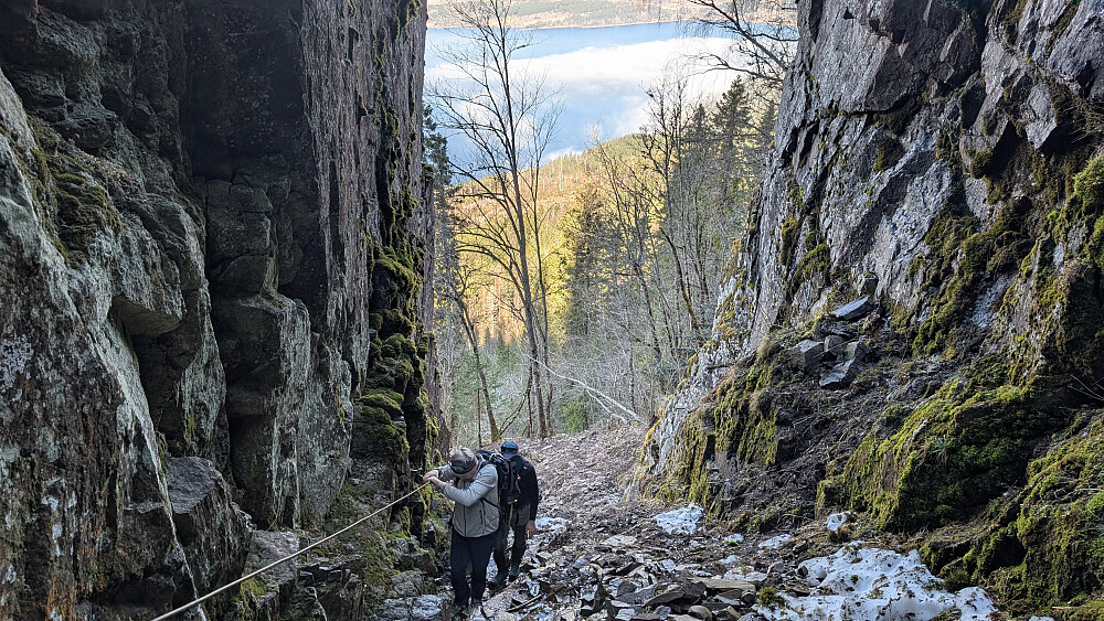 Turplanen ble ikke klar før på morran. Ringte Nils Jørgen kl 08.15 og han sa ja med en gang! Ståle ble også med, men jeg var litt usikker på hvordan han ville takle juvet. Det var tøffere forhold der oppe nå enn vanlig. Mer vann og is. Nils Jørgen gikk bak Ståle og hjalp han litt. Dette var nok noe av det heftigste han hadde vært med på tror jeg. Jeg hadde nok med å hjelpe Embla og meg selv der i bratta på glattisen og vannet som rant. Det går wire på ene sida som er god og ha. Tau også stedvis. Helt i øverste del ingen wire, men to tau. Det ene er svært slitt og skummelt. Ligger med løse kordeler over en skarp kant. Stoler du 100% på dette kan ting gå veldig galt. Ble tas helt vekk, eller byttes ut så fort som mulig. Vet ikke hvem som har ansvar for dette...om noen.