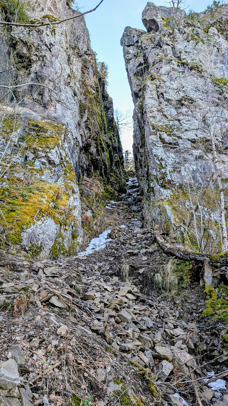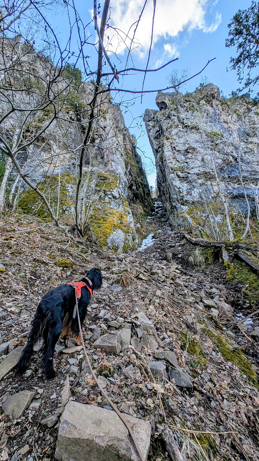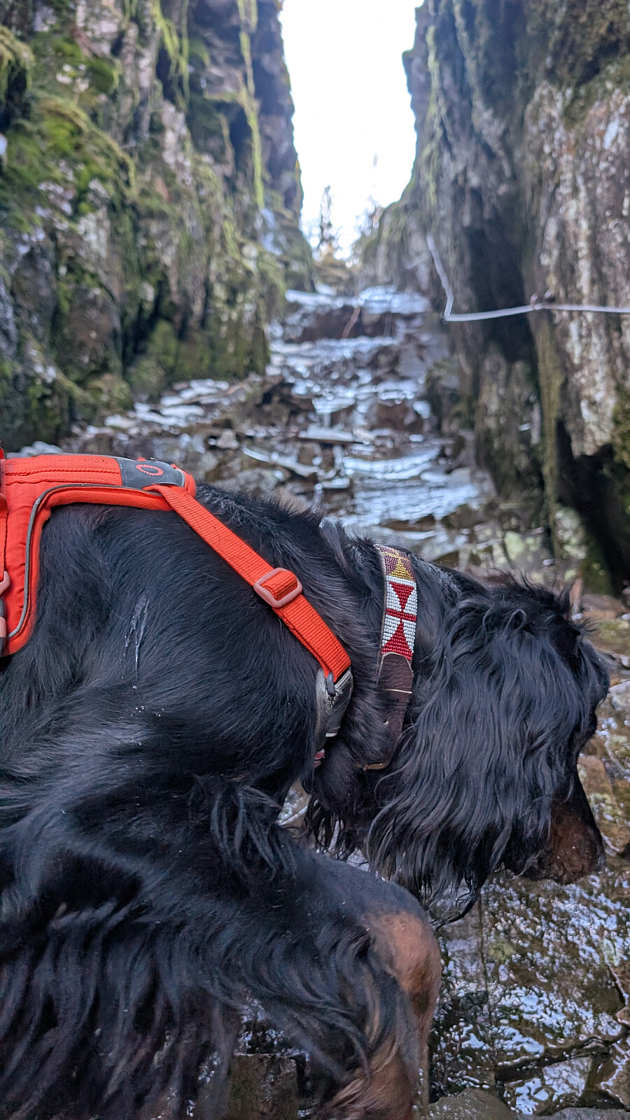 Turplanen ble ikke klar før på morran. Ringte Nils Jørgen kl 08.15 og han sa ja med en gang! Ståle ble også med, men jeg var litt usikker på hvordan han ville takle juvet. Det var tøffere forhold der oppe nå enn vanlig. Mer vann og is. Nils Jørgen gikk bak Ståle og hjalp han litt. Dette var nok noe av det heftigste han hadde vært med på tror jeg. Jeg hadde nok med å hjelpe Embla og meg selv der i bratta på glattisen og vannet som rant. Det går wire på ene sida som er god og ha. Tau også stedvis. Helt i øverste del ingen wire, men to tau. Det ene er svært slitt og skummelt. Ligger med løse kordeler over en skarp kant. Stoler du 100% på dette kan ting gå veldig galt. Ble tas helt vekk, eller byttes ut så fort som mulig. Vet ikke hvem som har ansvar for dette...om noen.