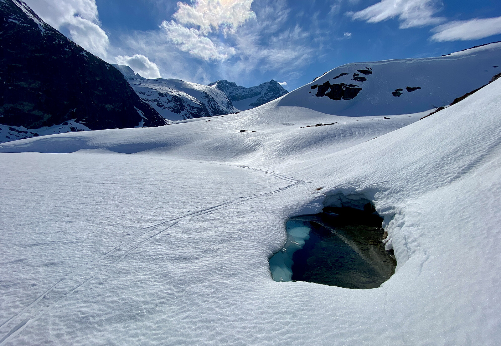 Et ørlite jubileum, akkurat 50 år siden mitt første besøk på Sjøvdøla, den gang sammen med Søren Aandahl som også var fotograf. Den gang fint varmt sommervær, idag kald vind og knallhardt føre. I år brukte jeg litt over 5 timer, den gangen var vi ute i ca.14 timer fra vi startet 05 på morran til vi var tilbake med bilen.