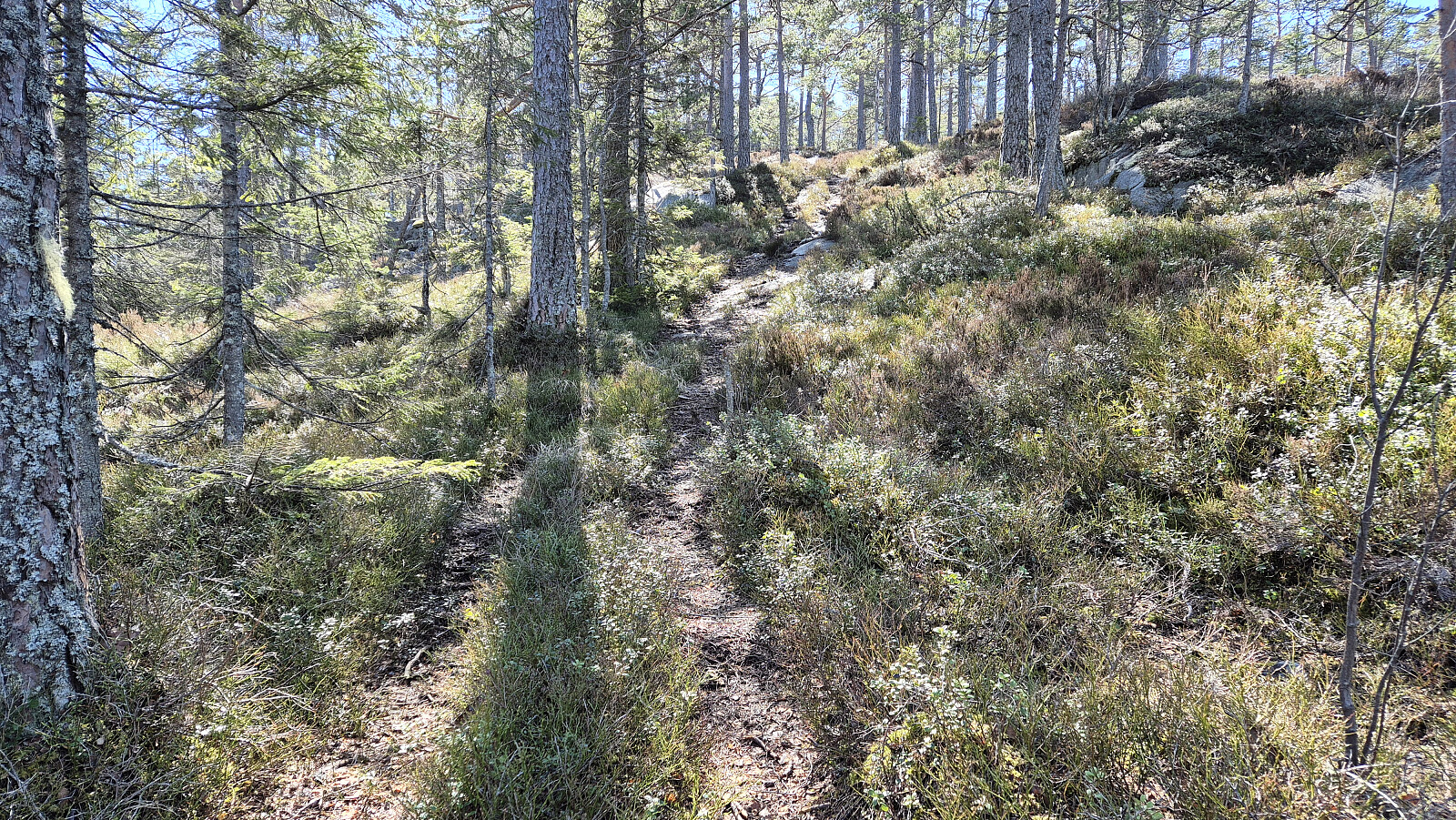 Like vest for Igletjønn vurderte jeg et par sekunder om jeg bare skulle følge traktorveier tilbake mot bilen, eller ta en omvei via Skurvåsene (386). Av GPS-sporet ser man jo at jeg valgte det siste ... Denne omveien ble en blanding av bushing, vandring på veier og litt sti. For selv om man ikke ser det på kartet, gikk det en nokså tydelig sti siste biten mot Skurvåsene som startet fra Landsverkvegen et sted. Jeg kom inn på stien etter noen få meter fra veien, og jeg trodde jo stien gikk til toppen. Det gjorde den ikke, for den gikk til eiendommen som ligger tett inntil toppen. Så siste 30-40 meterne til topps måtte jeg vandre i lyngen.